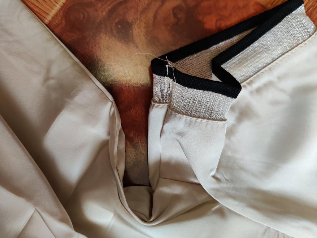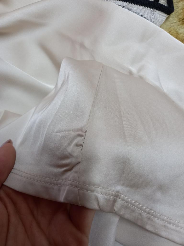 Silky, pure white color, almost no stretch, loose sleeve.