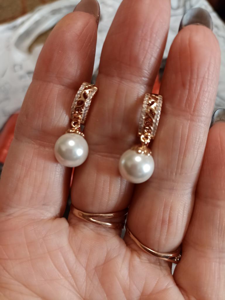 The clasp is acting up, it gets stuck. One earring fastens with a click, the other one doesn't. Made in red gold plated. Imitation pearls. The price is clearly too high for plastic.