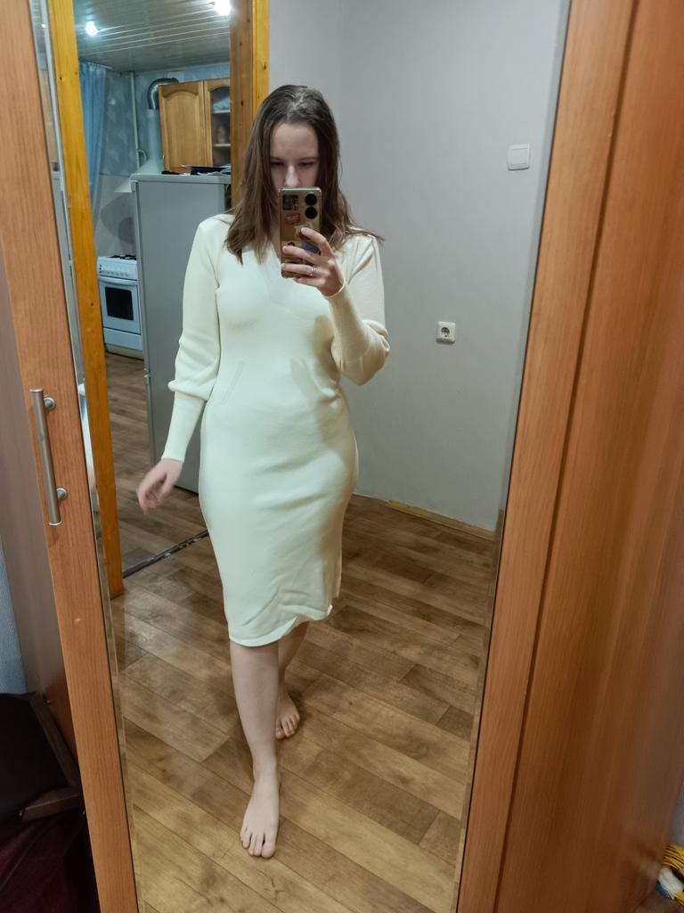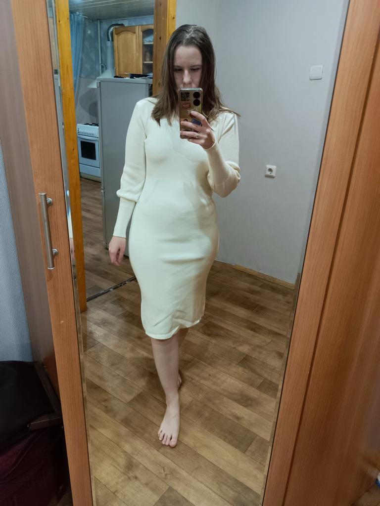 I give it three stars because it doesn't deserve five stars, no matter how wonderful the dress is. The dress is the right color, a very beautiful deep wine color, exactly what I wanted. It fits the figure perfectly, it's tight, it emphasizes everything that needs to be emphasized. but: 1. the style is not at all what is stated in the photo or in the description. in fact the dress is knitted, from high-quality soft yarn. 2. There are indeed some sagging on the sleeves, but they are not visible on the body at all. It just fits the arms tightly 3. the neckline is also not the same, much shallower. and when you put it on, it generally stretches and becomes a regular, U-shaped. well, not the one that is presented in the photo and I expected something completely different. 4. at the waist, under the ribs and to the navel, strange inserts are made of a different knit. I'll attach a photo below. Well, I don't know, there wasn't anything like that in the photo, so I don't really care. But it's almost invisible on the body, so it's ok. But still, I have a strange feeling, like I'm an old granny in a strange old knitted dress. Overall, the dress is beautiful. I will wear it, it fits perfectly, it looks spectacular. I will try to wear it with confidence. And yet I am very upset that the product does not quite match the description..