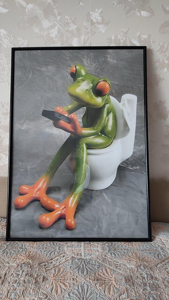 Funny Green Frog Sitting On Toilet Oil Painting Modern Animal Art Picture Bathroom Hotel Home