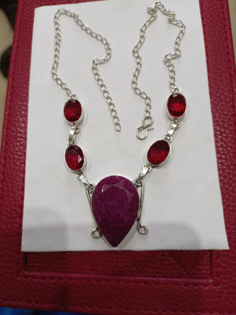 A gorgeous silver necklace with rubies, as in the photo. The silver hallmark is present. The length of the necklace is 52.5 cm. The size of the large ruby is 3.5 cm × 2.4 cm (at its widest part). The size of the smaller stone is 1.4 cm × 1.0 cm. High-quality craftsmanship. Looks more beautiful than in the photograph. A magnificent purchase.