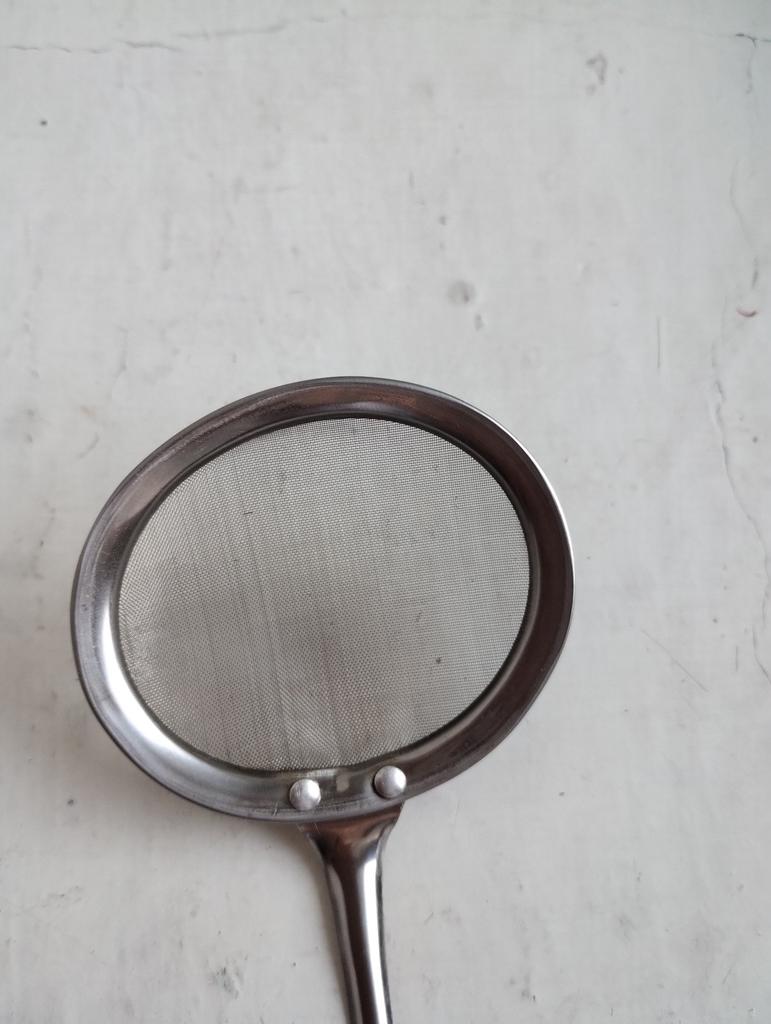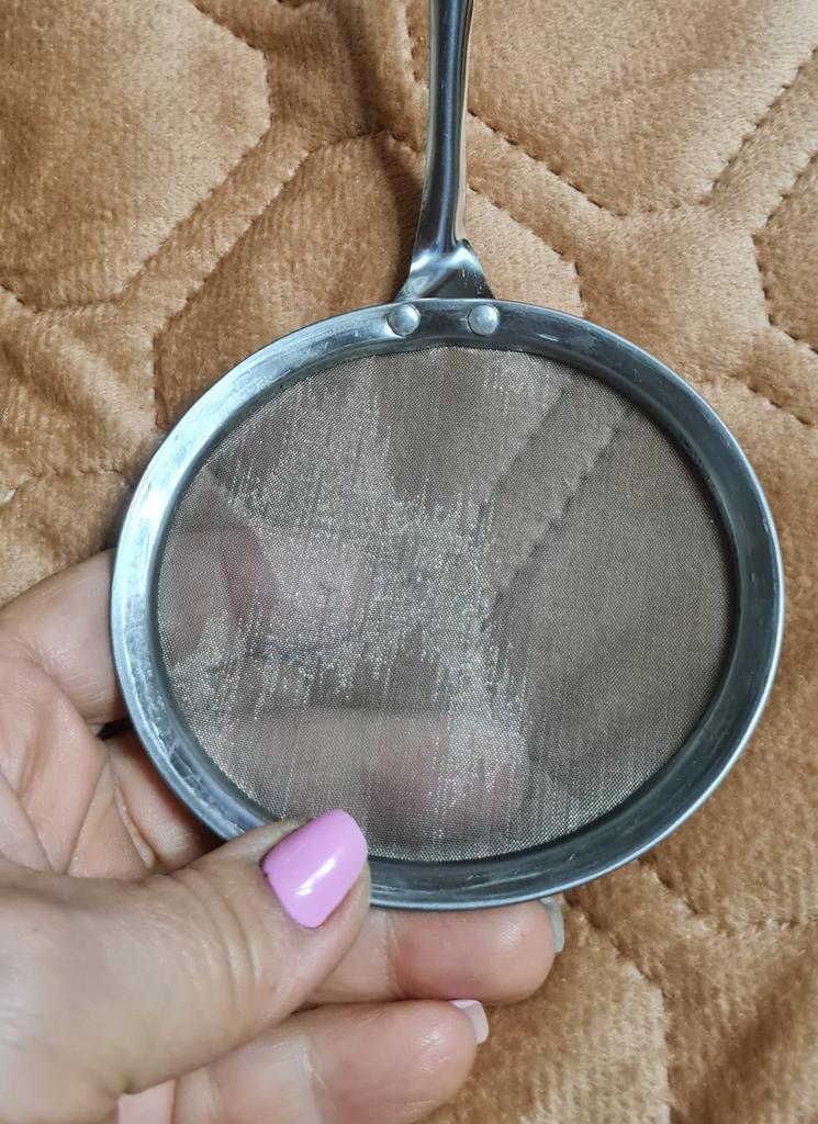 Norm, a mesh, almost the same diameter as a standard saucer. Made of thin metal.