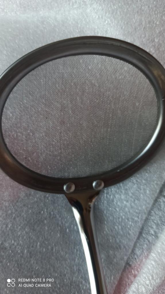 Stainless steel skimmer with very fine mesh, 20 cm handle, 10 cm diameter, the handle seems a little short to me in case of strong boiling, do not hesitate to take a longer handle if necessary. Boiling oil is particularly dangerous!!!...I put a small spoon next to it to give an order of magnitude.