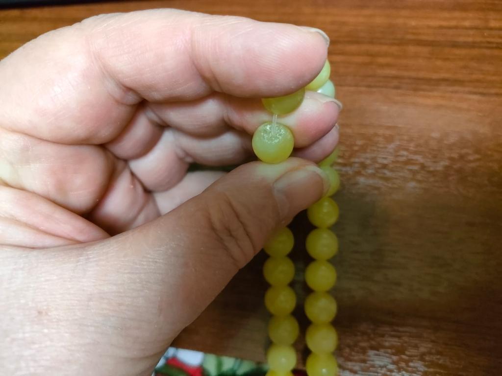 I expected the color to be more yellow, like in the promotional photo, but in reality they are more green. I got beads with black spots - I made a bracelet, a ring, and a short 2-strand necklace with 1.2-D;0.4-D