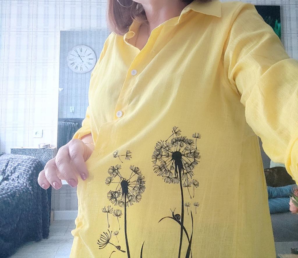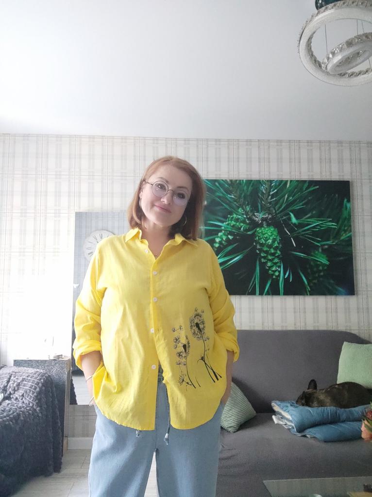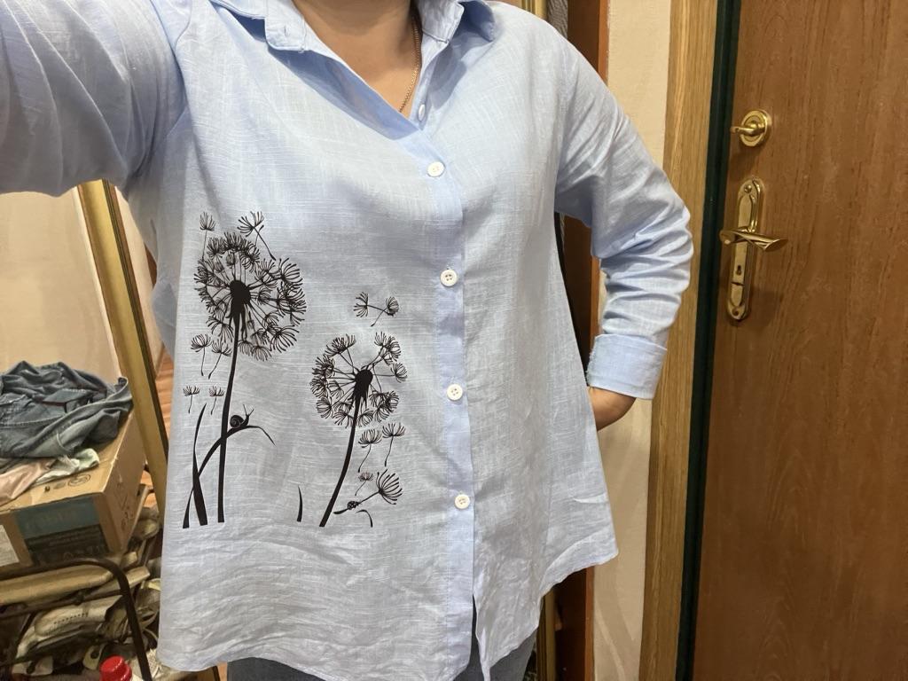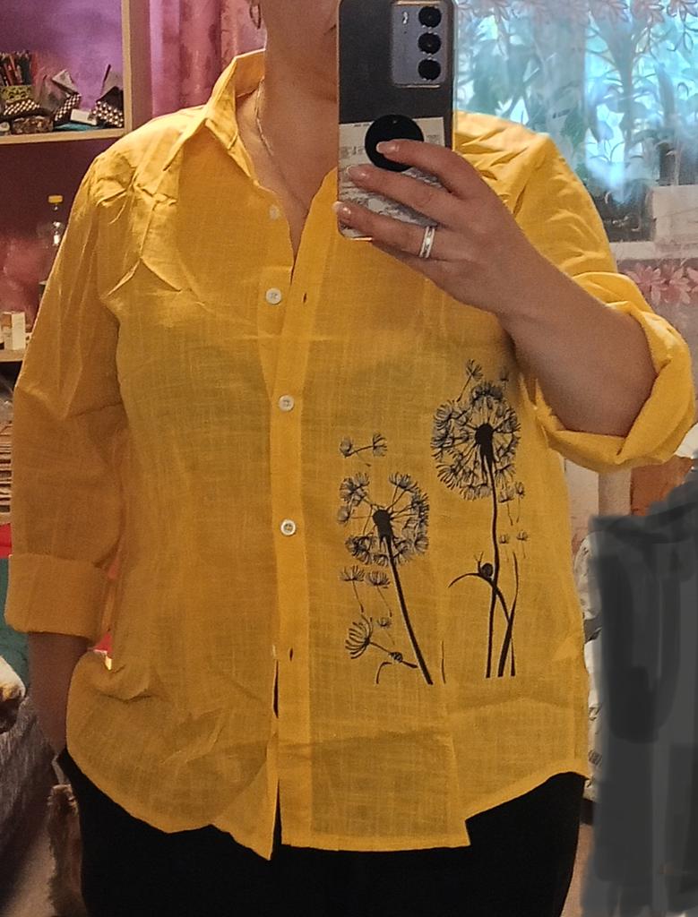 The blouse fit perfectly at size 52, it’s light, transparent, and very comfortable.
