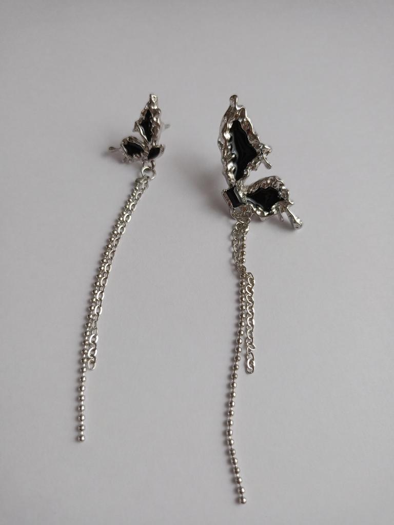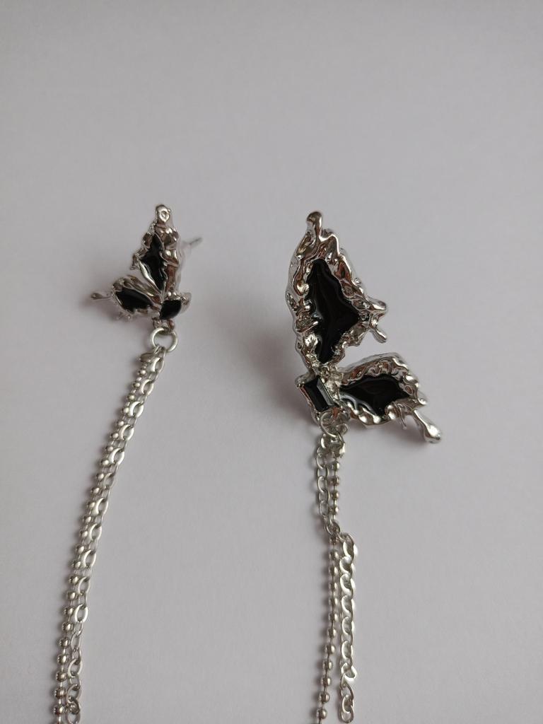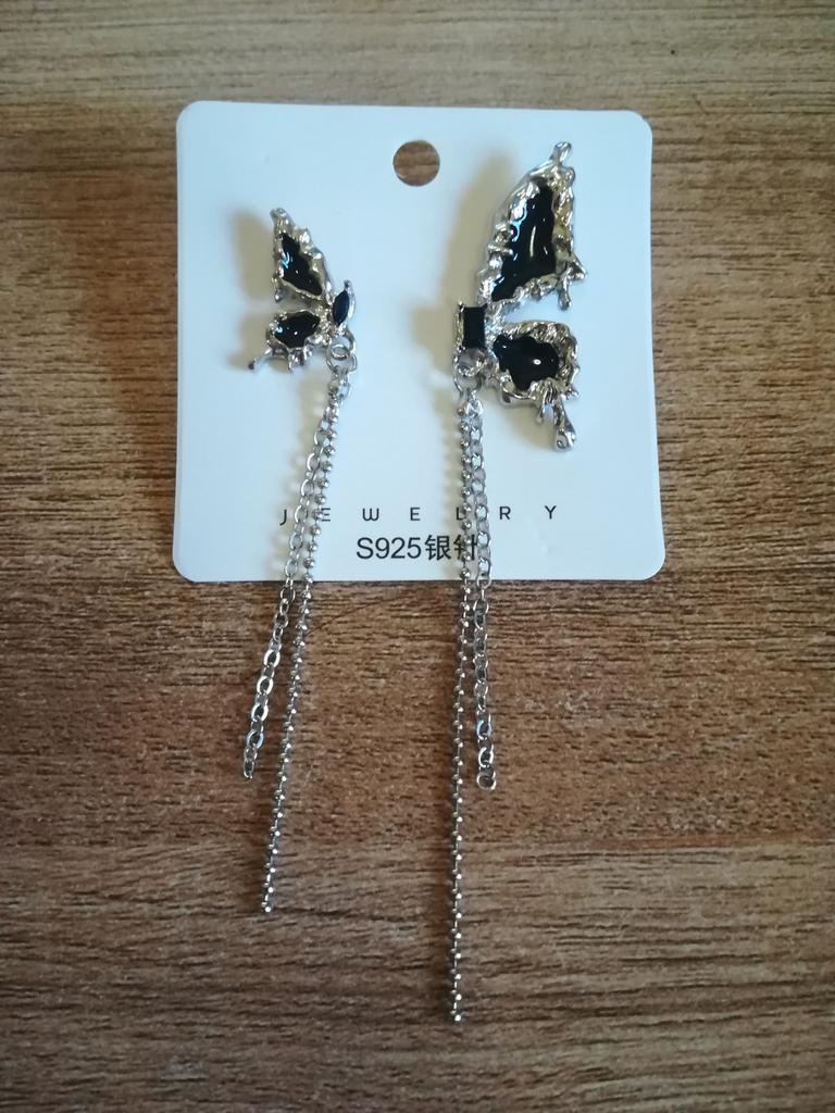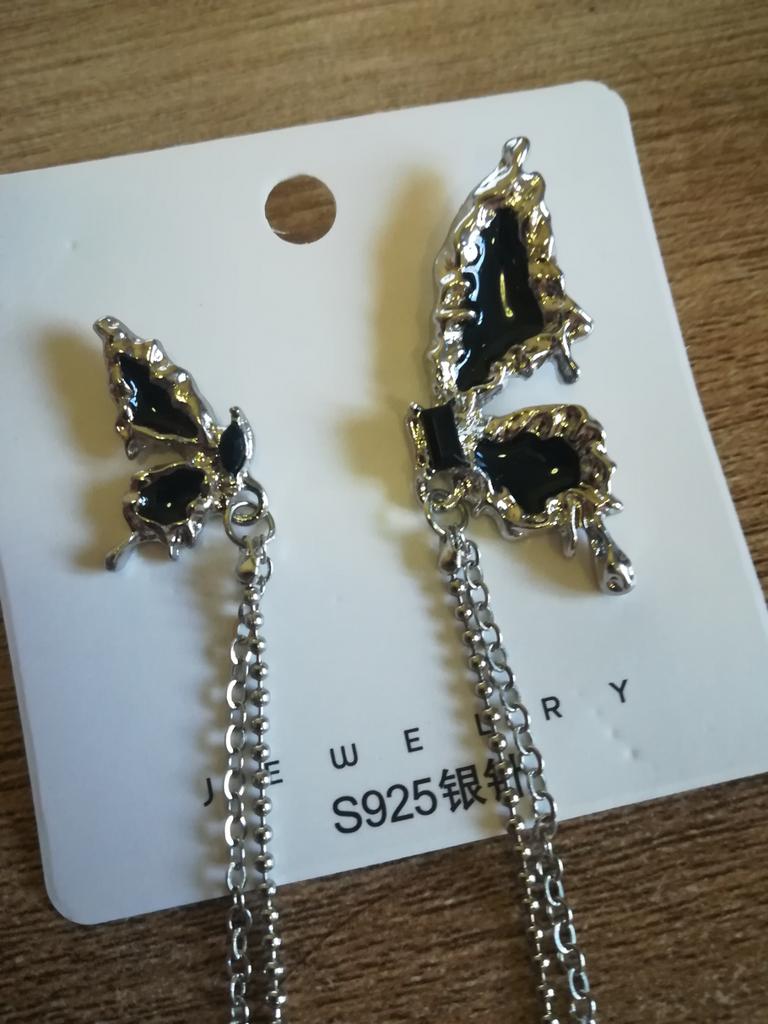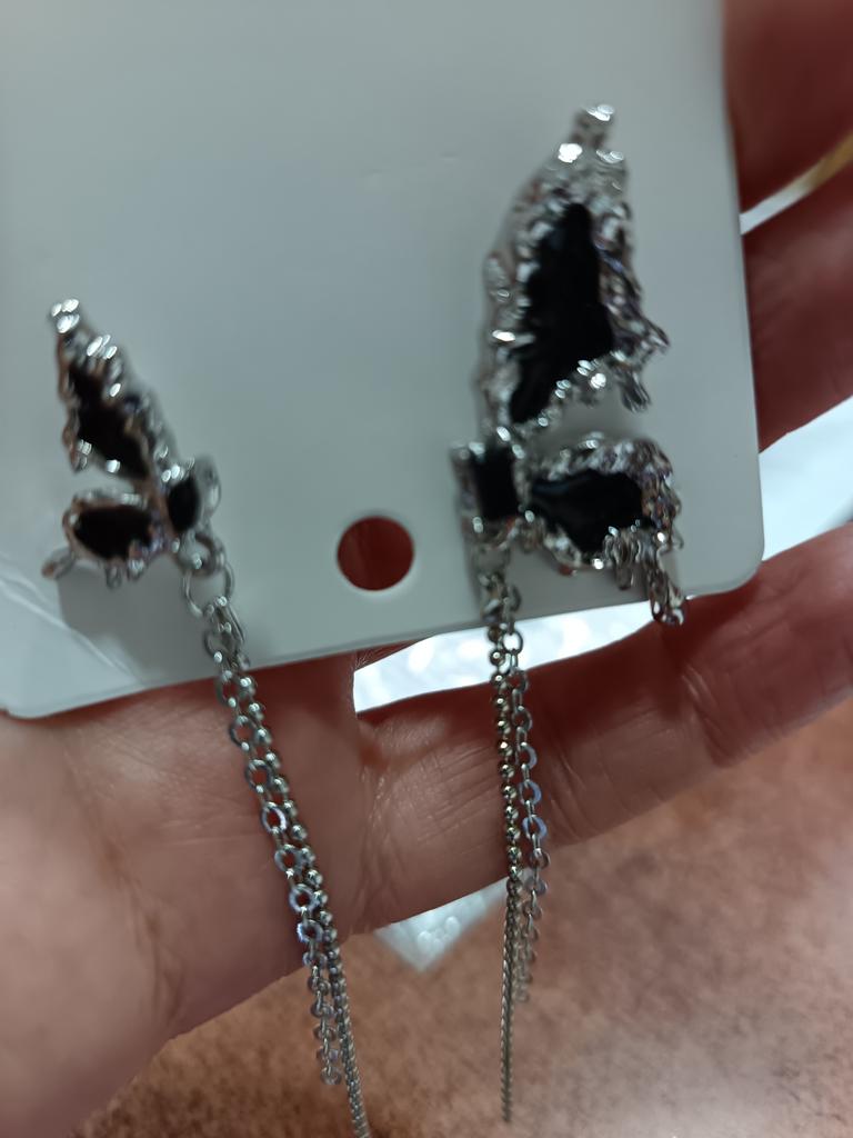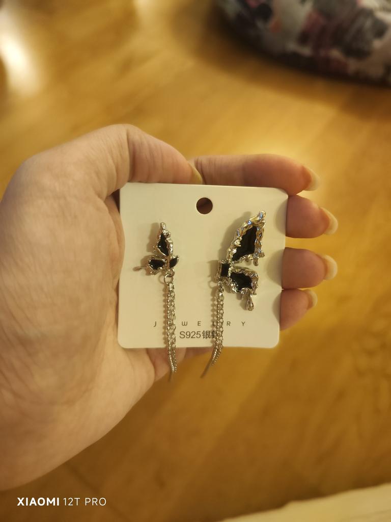 This is Chic and Unique Butterfly Earrings , A Must-Have😍 I'm thrilled with my purchase of these asymmetrical butterfly earrings. Their half-wing design per ear is both unique and eye-catching. The black stones add an elegant flair, and the tassel detail brings a playful yet stylish touch. Made of Cubic Zirconia and Copper, these earrings (17*20mm, 10g) are lightweight and comfortable, perfect for daily wear. The added chain on each wing is a lovely feature, enhancing their beauty. Delivery was fast, arriving in just 9 days. In summary, these earrings are a fantastic fashion statement. Highly recommended for their distinctive style and quality! أنا متحمسة جداً لشرائي هذه الأقراط الفراشة غير المتماثلة. تصميمها النصفي لكل أذن فريد وجذاب. الأحجار السوداء تضيف لمسة من الأناقة، والتفصيل الشراشيب يجلب لمسة مرحة وأنيقة في نفس الوقت. مصنوعة من الزركونيا المكعبة والنحاس، هذه الأقراط (17*20 مم، 10 جم) خفيفة الوزن ومريحة، مثالية للارتداء اليومي. السلسلة المضافة على كل جناح هي ميزة جميلة تعزز جمالها. كان التوصيل سريعًا، ووصلت في غضون 9 أيام فقط. باختصار، هذه الأقراط هي بيان أزياء رائع. أوصي بها بشدة لأسلوبها المميز وجودتها!