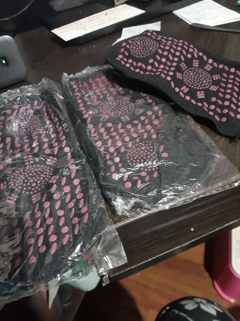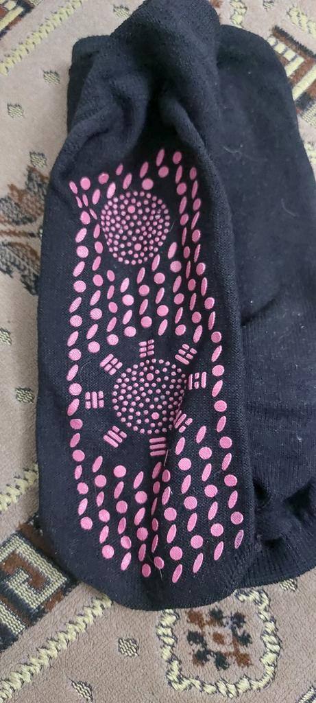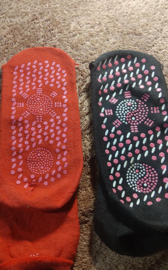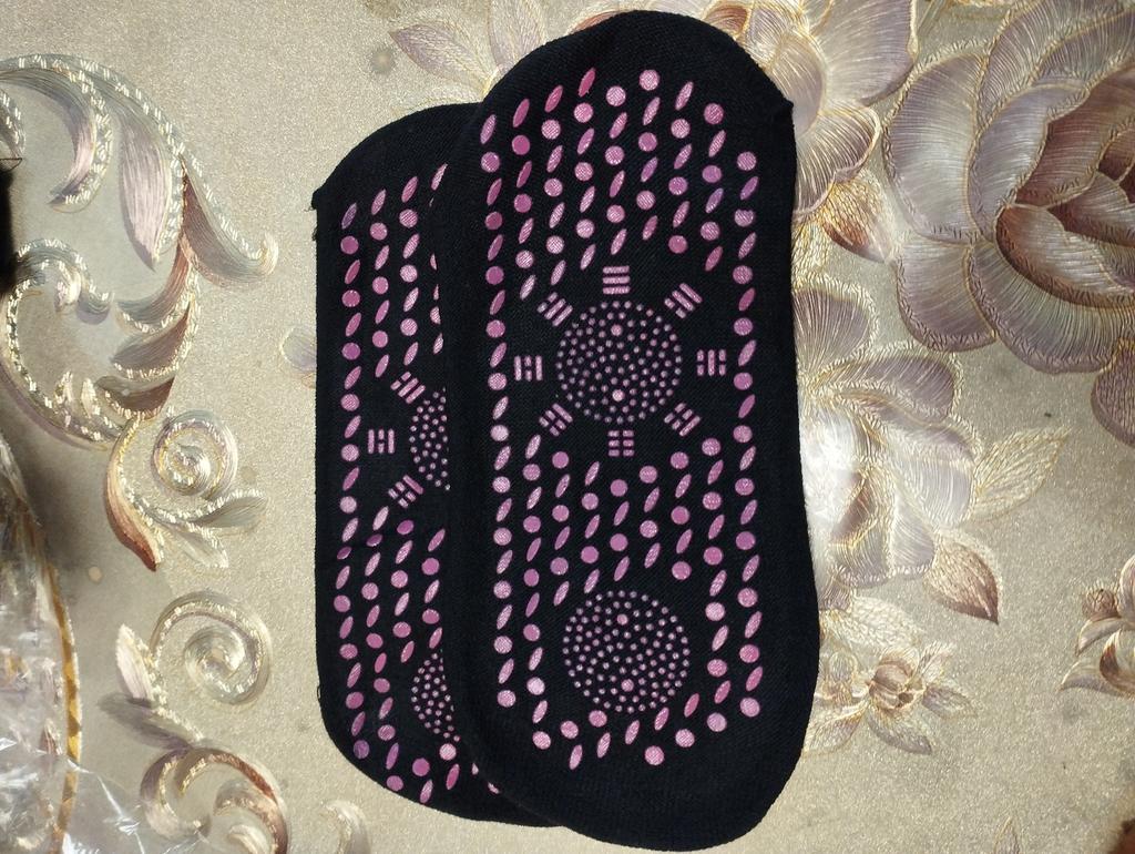 The socks fit snugly, but the red socks are not the same as the black ones. The red ones have non-colored tourmaline dots, all of the same color, and the top circle is 30 mm, while the black ones have a circle of 39 mm, and the tourmaline is a thinner layer in the red socks. The first impression is not so good.