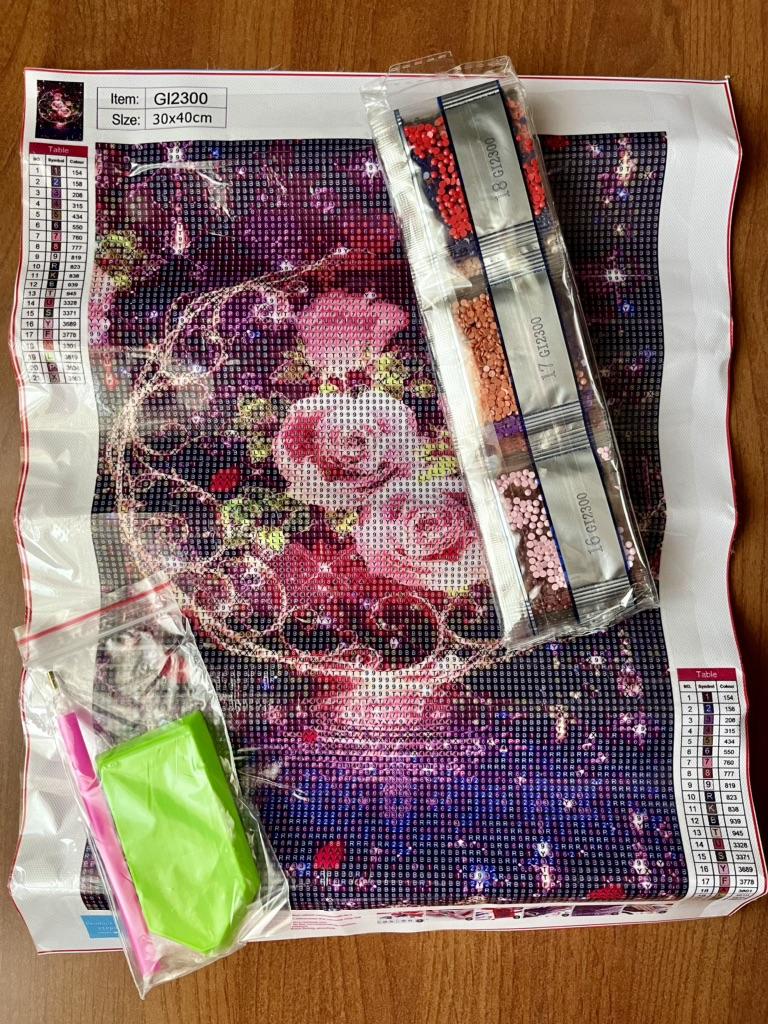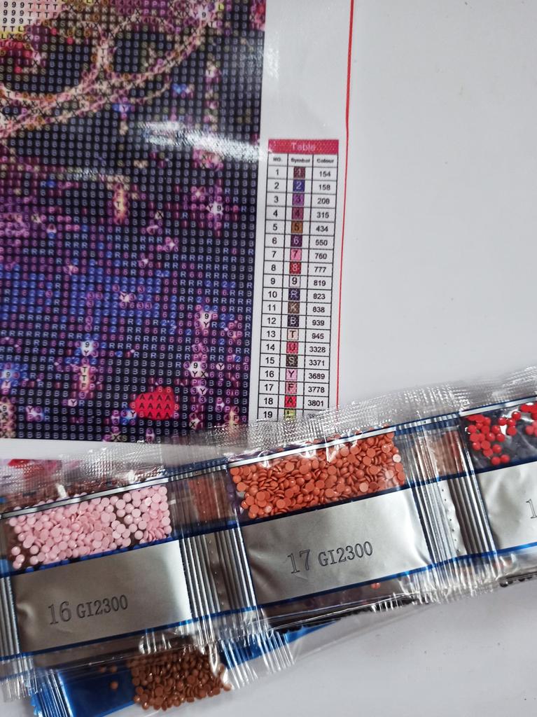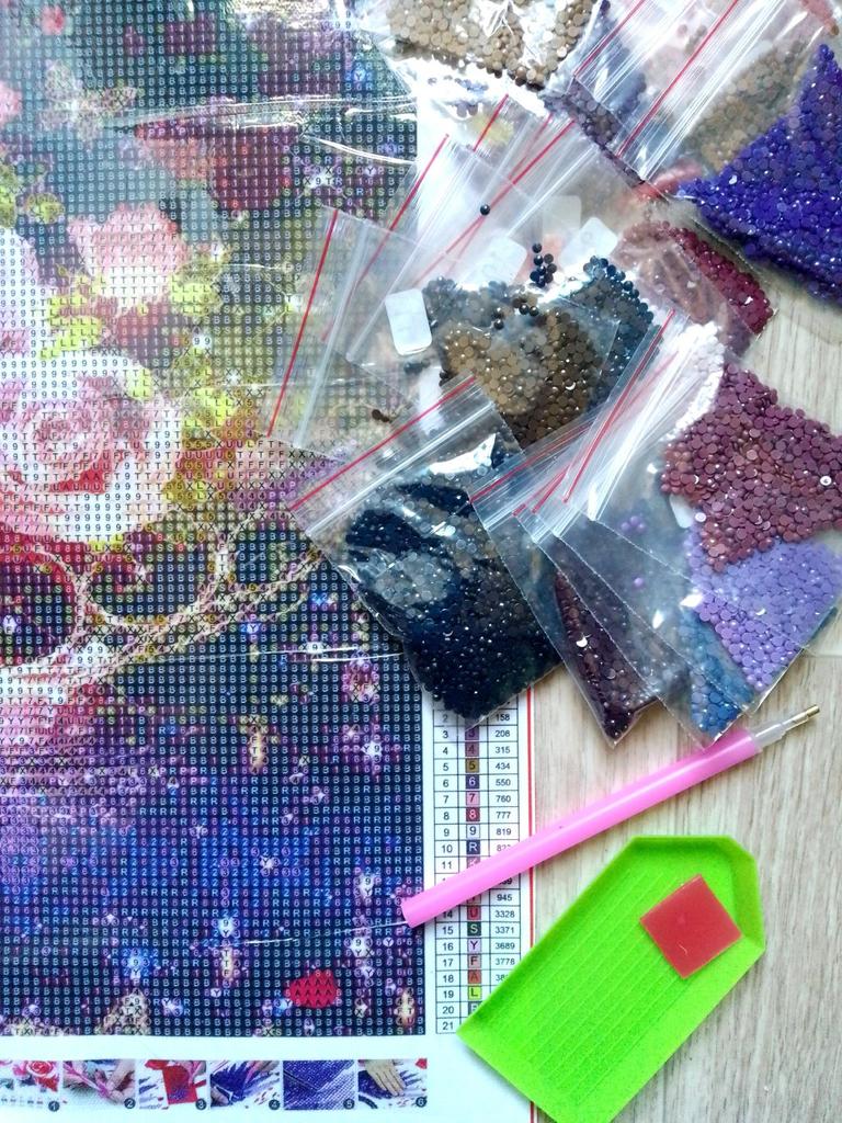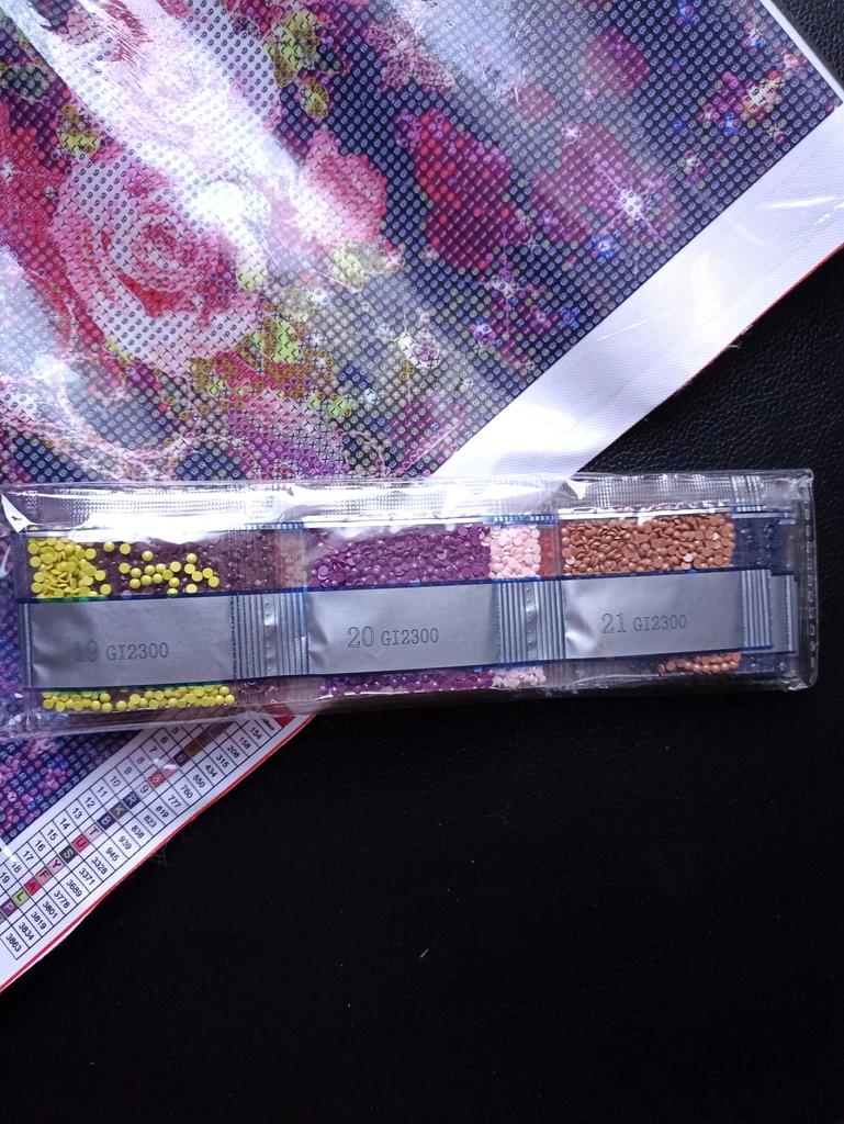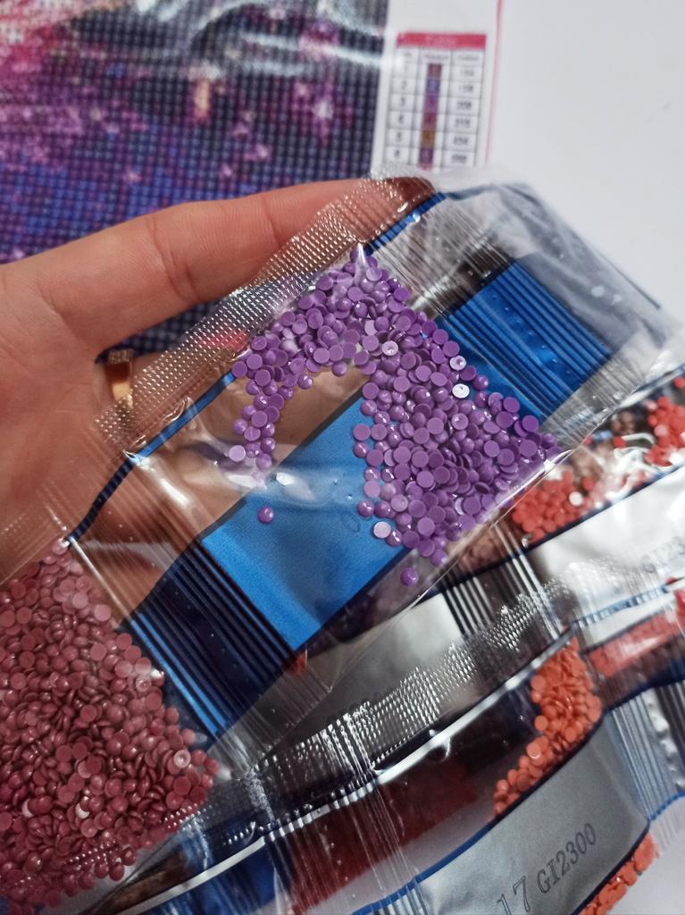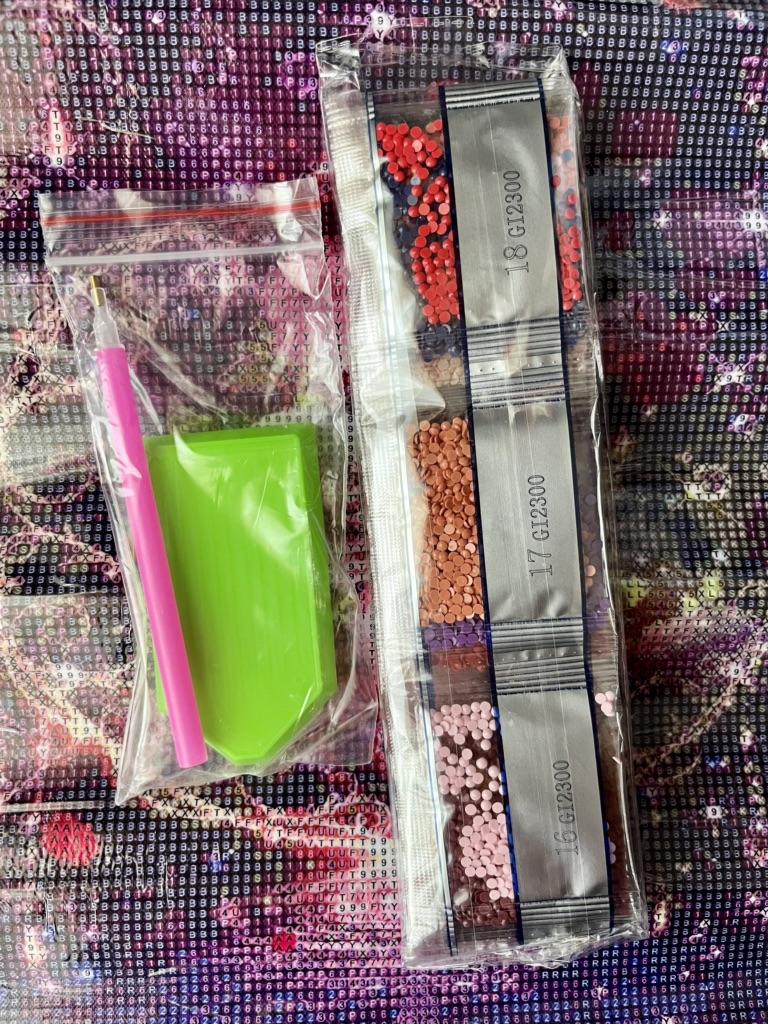 I love diamond paintings, I ordered this painting as a gift, so I didn’t collect it. Set includes 21 colors of stones + pen, bowl and glue. It’s convenient that there is a transparent film on top, you can see the pattern, so it will be very convenient to pick up. Painting size 30 by 40. It’s a pity there are no bags to pour the stones in, since they are not in zip bags.