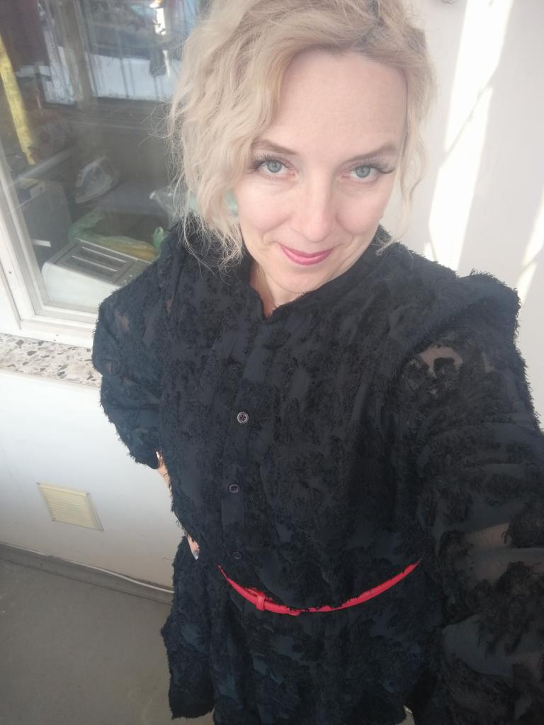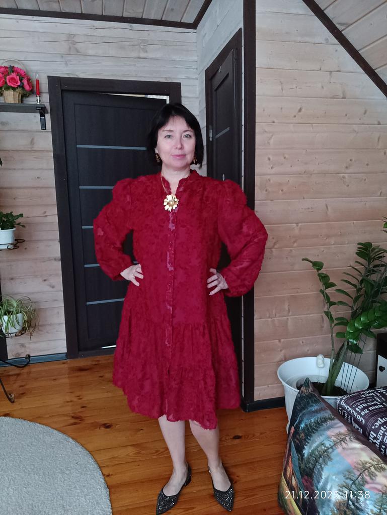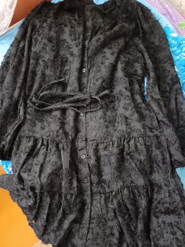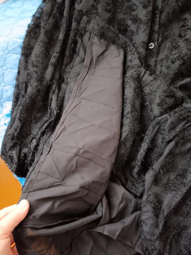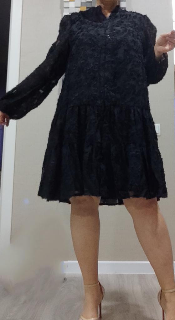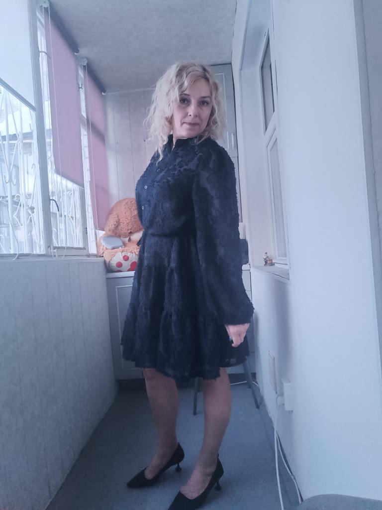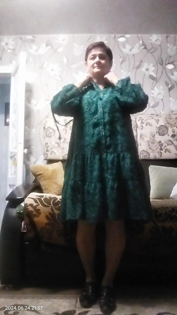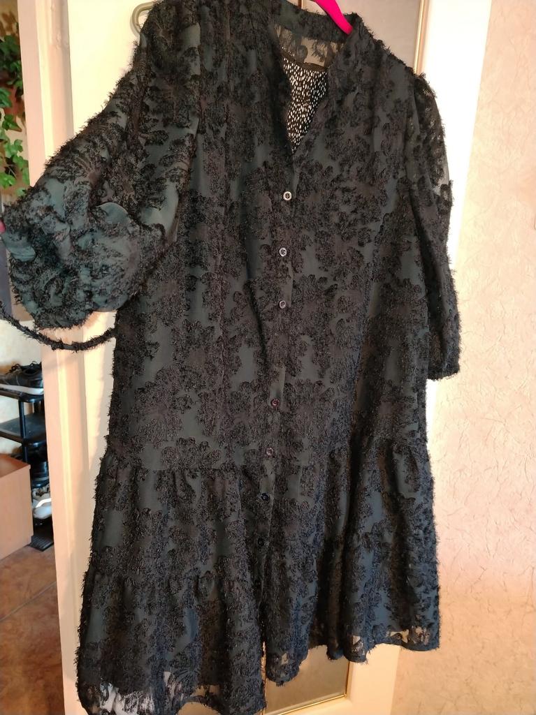 The dress is m 46-48 big, especially the sleeves, the black color doesn’t suit me, I’m not delighted, but the fabric is interesting, it was adjusted in the studio, I won’t wear it for regular wear