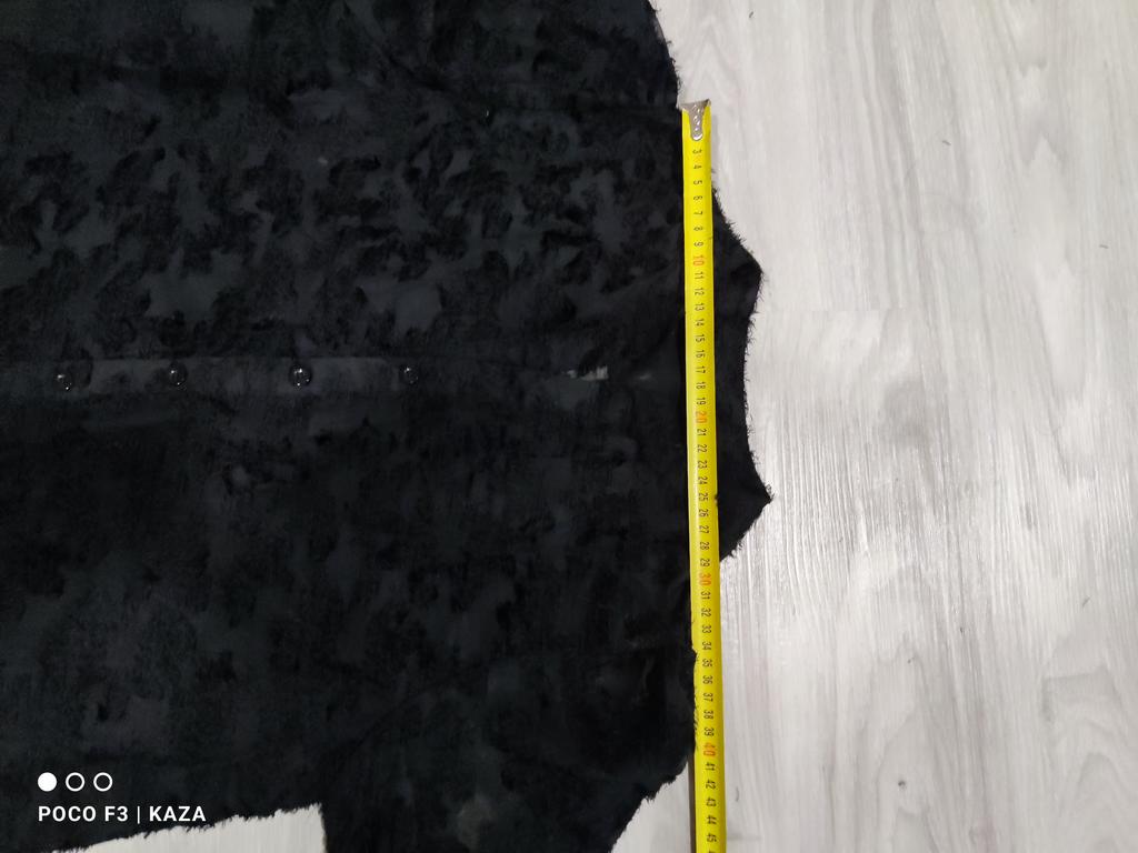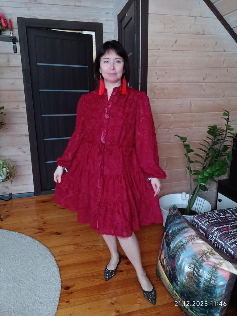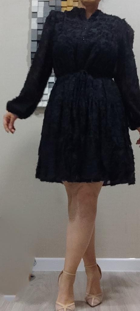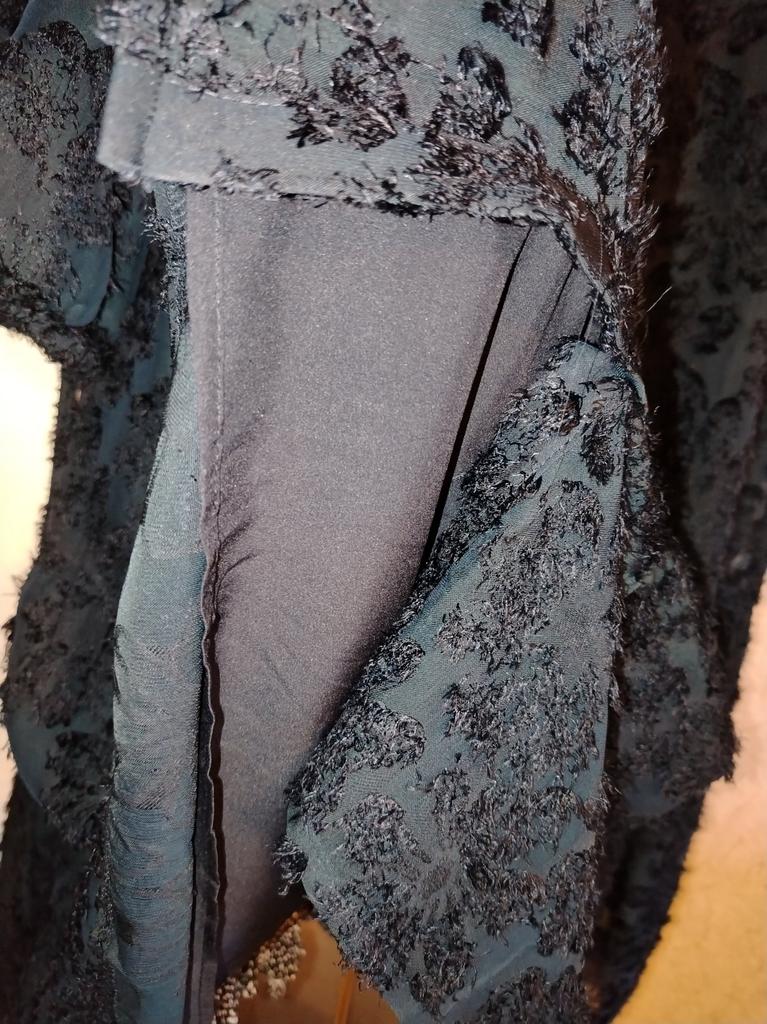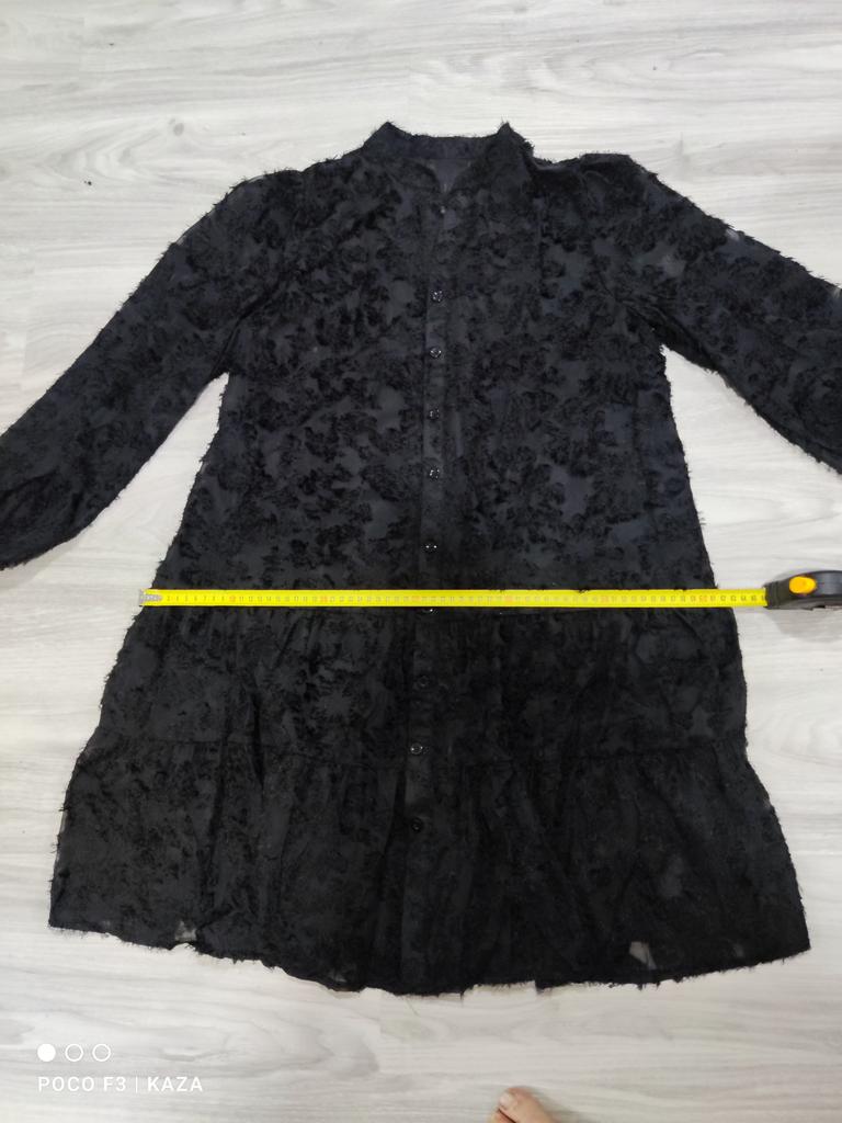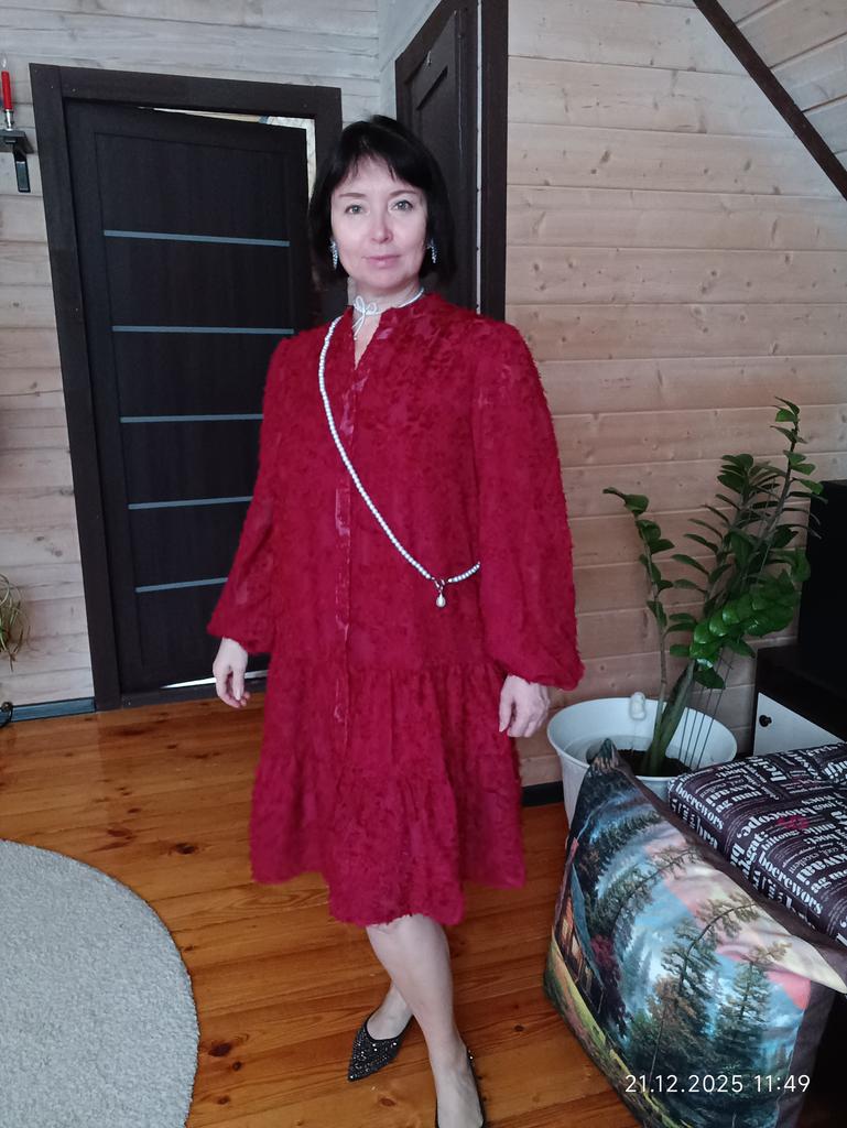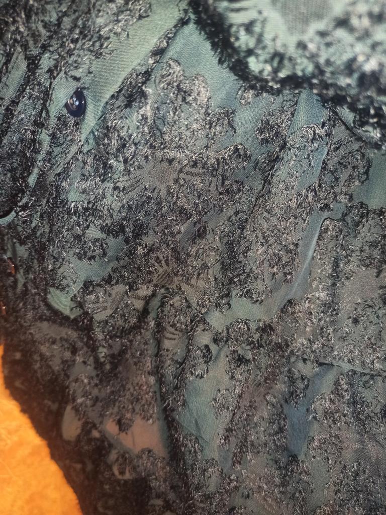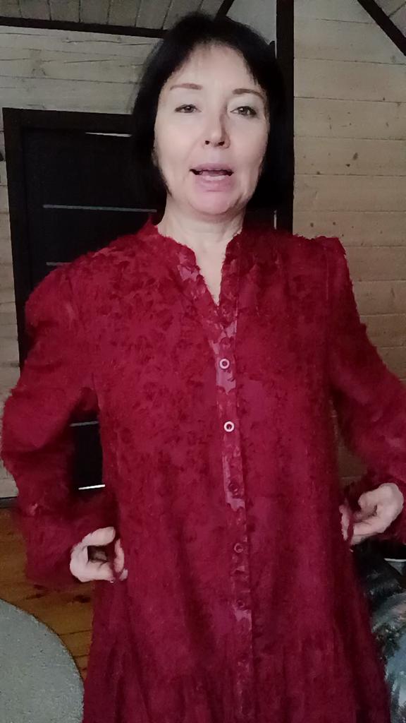 The dress is m 46-48 big, especially the sleeves, the black color doesn’t suit me, I’m not delighted, but the fabric is interesting, it was adjusted in the studio, I won’t wear it for regular wear