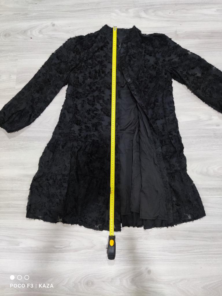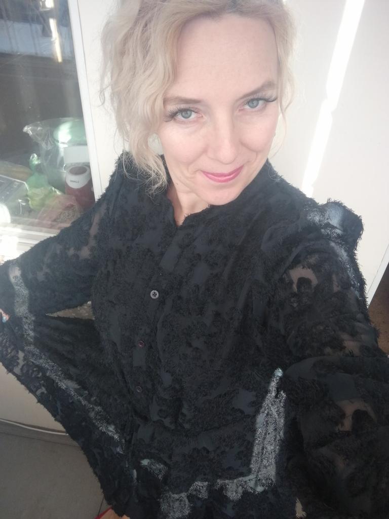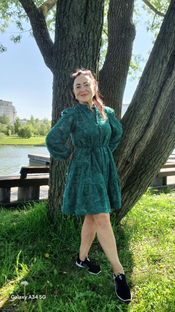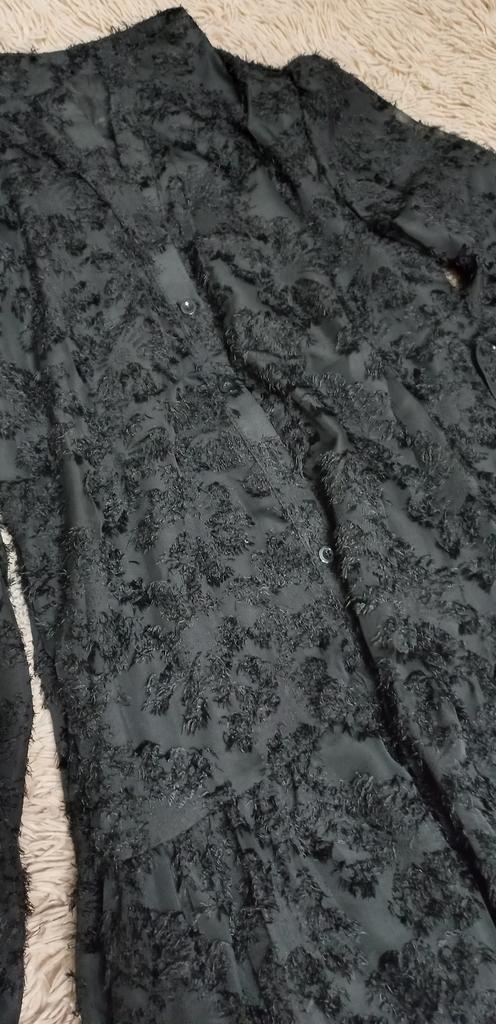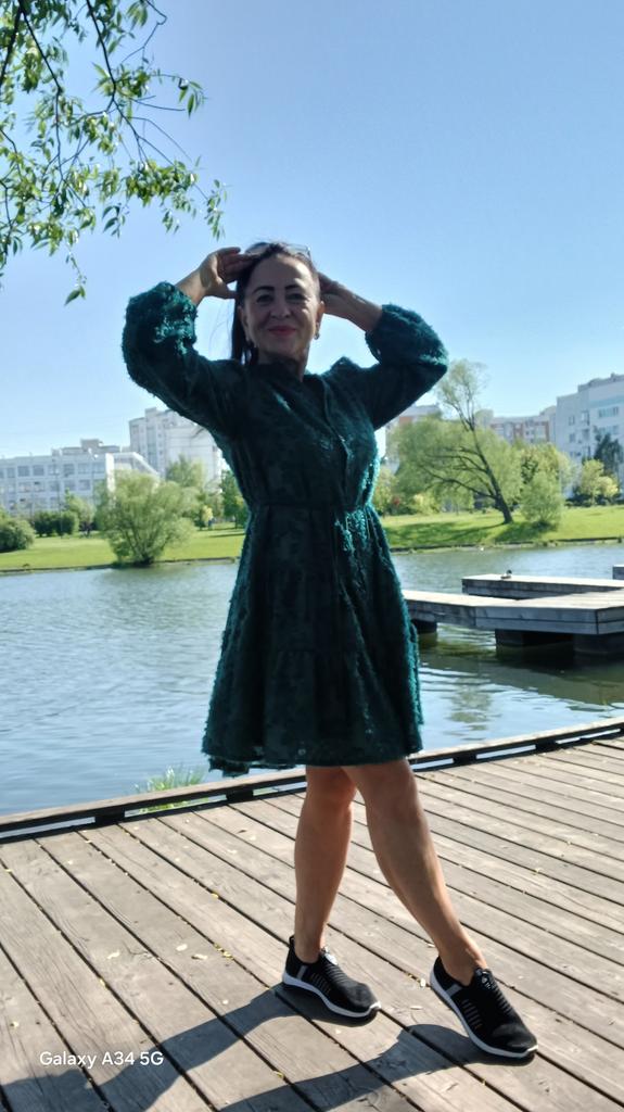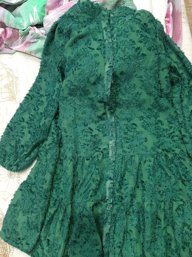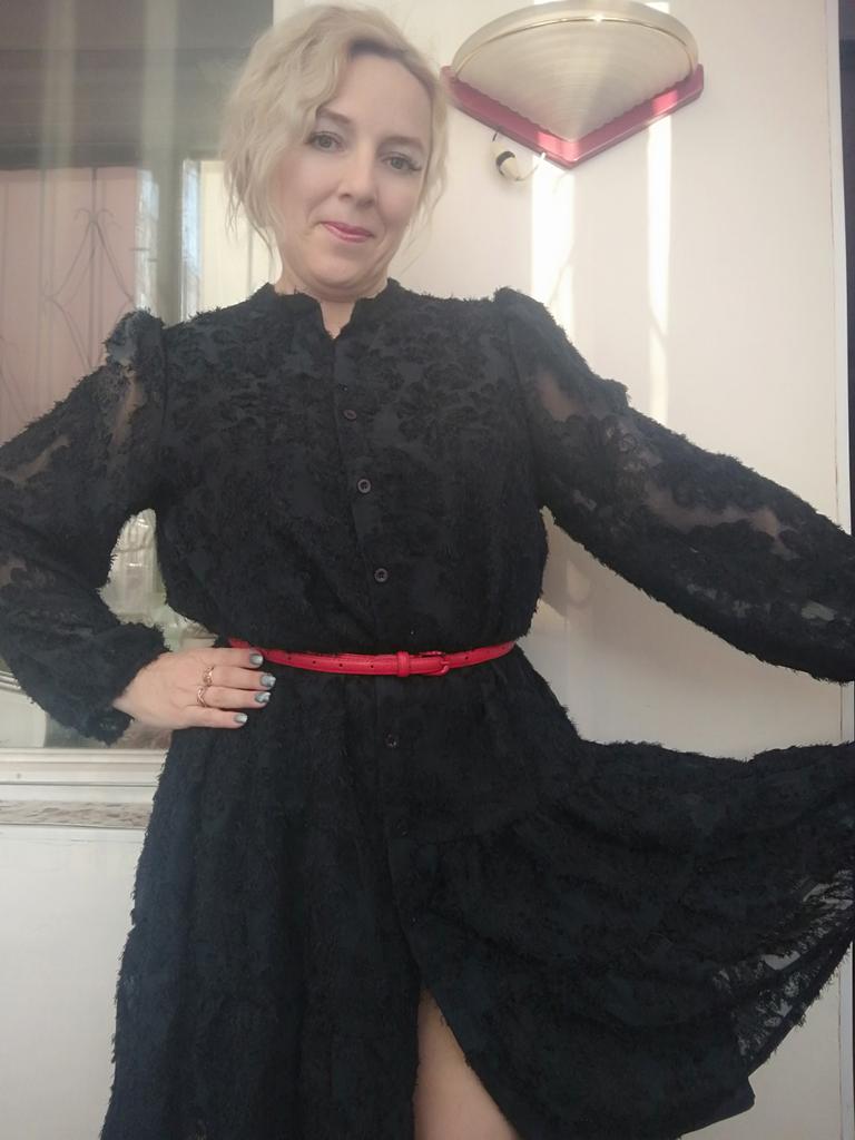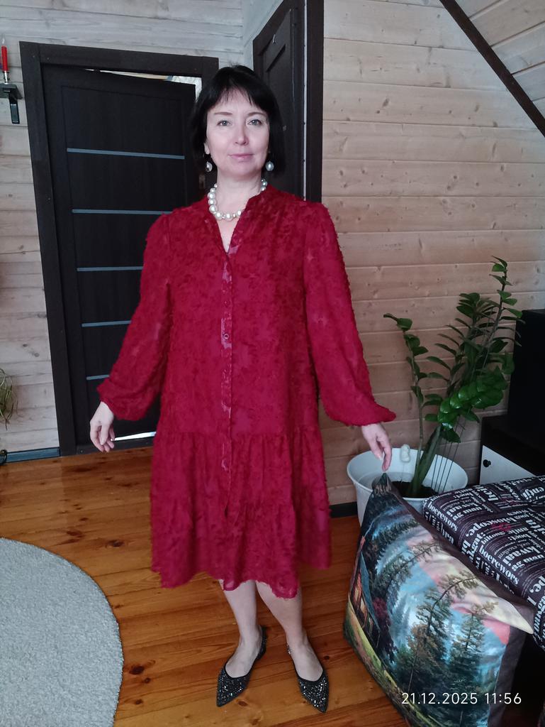 The dress is m 46-48 big, especially the sleeves, the black color doesn’t suit me, I’m not delighted, but the fabric is interesting, it was adjusted in the studio, I won’t wear it for regular wear