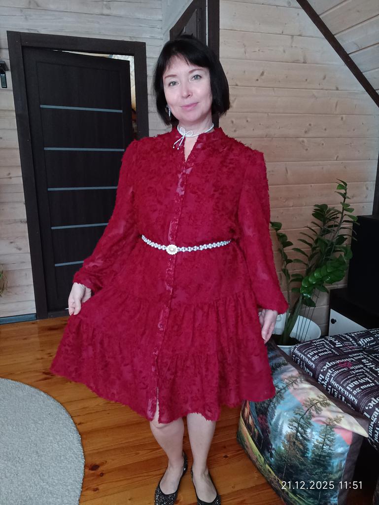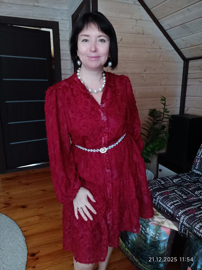 * elegant semi-transparent lace dress * 💥𝗟𝗶𝗲𝗳𝗲𝗿𝘇𝗲𝗶𝘁 22 Take 💥𝗟𝗶𝗲𝗳𝗲𝗿𝘂𝗺𝗳𝗮𝗻𝗴 The scope of delivery includes 1 dress with a matching belt in the appropriate color and size. The dress is available in 4 different colors (black, blue, green and red) in sizes S to XL. I ordered the dress in size S in burgundy red. I wear size 36 to 38. I weigh 62 kg over 172 cm. Cup size 75D. The dress fits me very well because it has a slightly looser cut. 💥𝗤𝘂𝗮𝗹𝗶𝘁ä𝘁 The dress is opaque everywhere (because it is double layered) except on the sleeves. I think that's great! 👌 The dress is not stretchy, but is cut a little looser. The color-matching belt included is used to create a beautiful waist. You could also wear the dress without a belt (see video), then the dress would be more of a babydoll and cut like a hanger. The dress has a nice color, it's not really red but more of a pink-red color, it doesn't come across that well in the photos and videos. I particularly like the eyelash lace and the slightly transparent details on the sleeves. 😊 The button placket on the chest can be unbuttoned, which can beautifully show off the cleavage. material composition : 100 % Polyester, Auvh I find the length in dress size m optimal for my height (172 cm) . 💥𝗙𝗮𝘇𝗶𝘁 Mega beautiful, elegant dress with eyelash lace and slightly transparent details that fits my figure perfectly thanks to the belt and creates a beautiful silhouette. You can order the dress in its original size. It fits true to size.