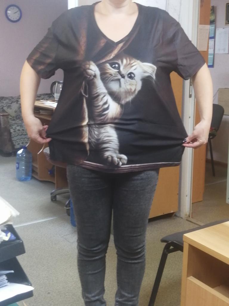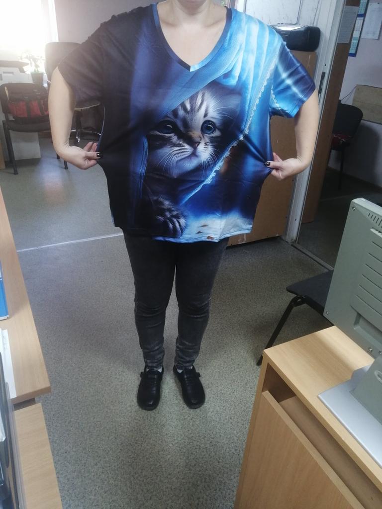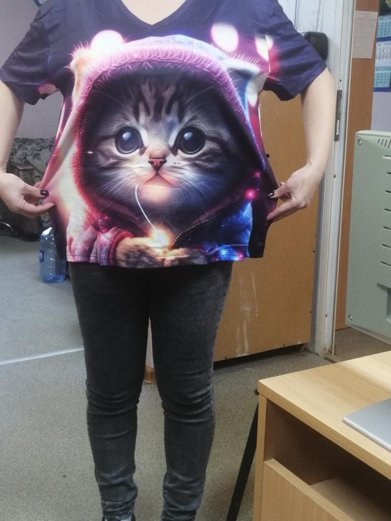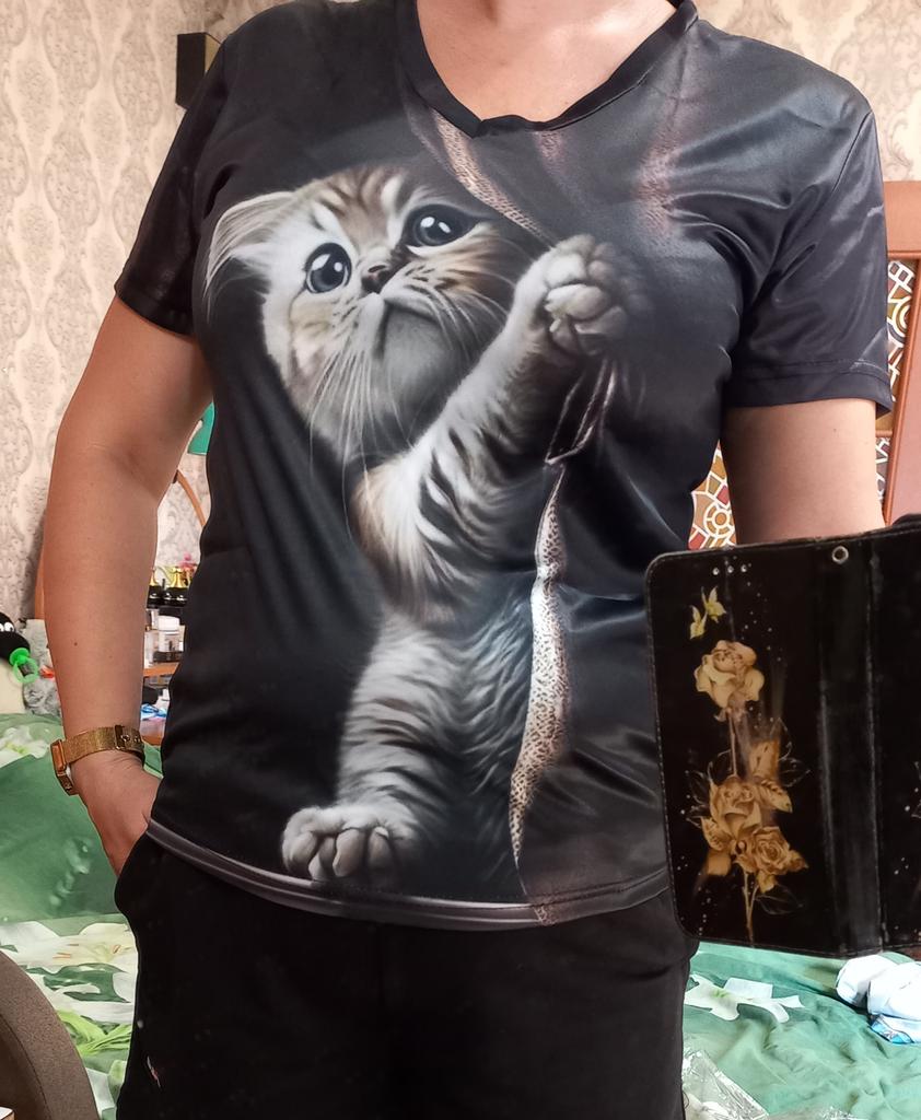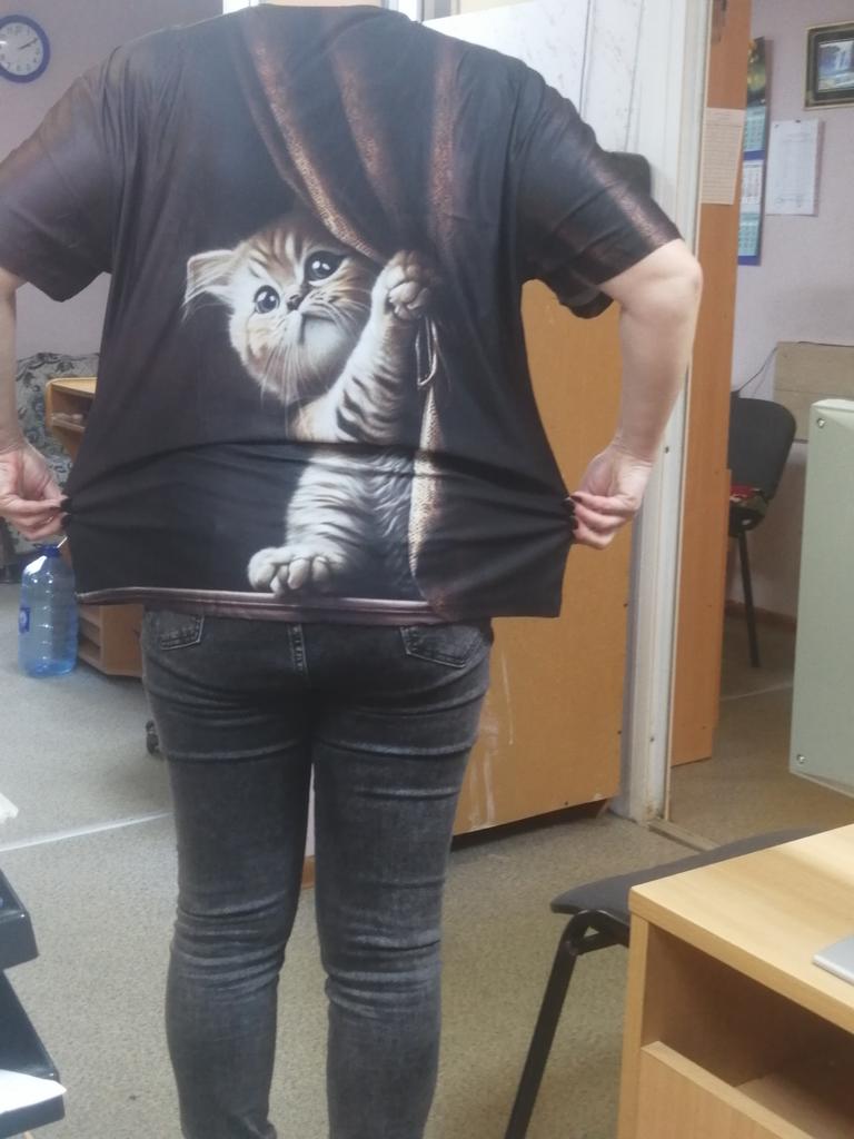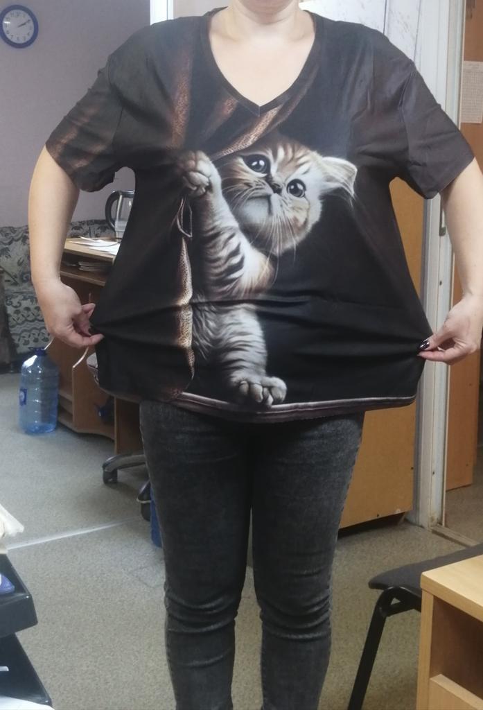 Excellent T-shirt, size L fits perfectly for 46-48, the material is high-quality, pleasant, this is the second one from the series with cats. Thank you.