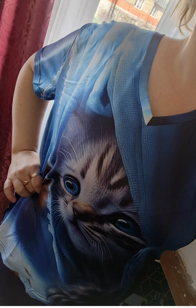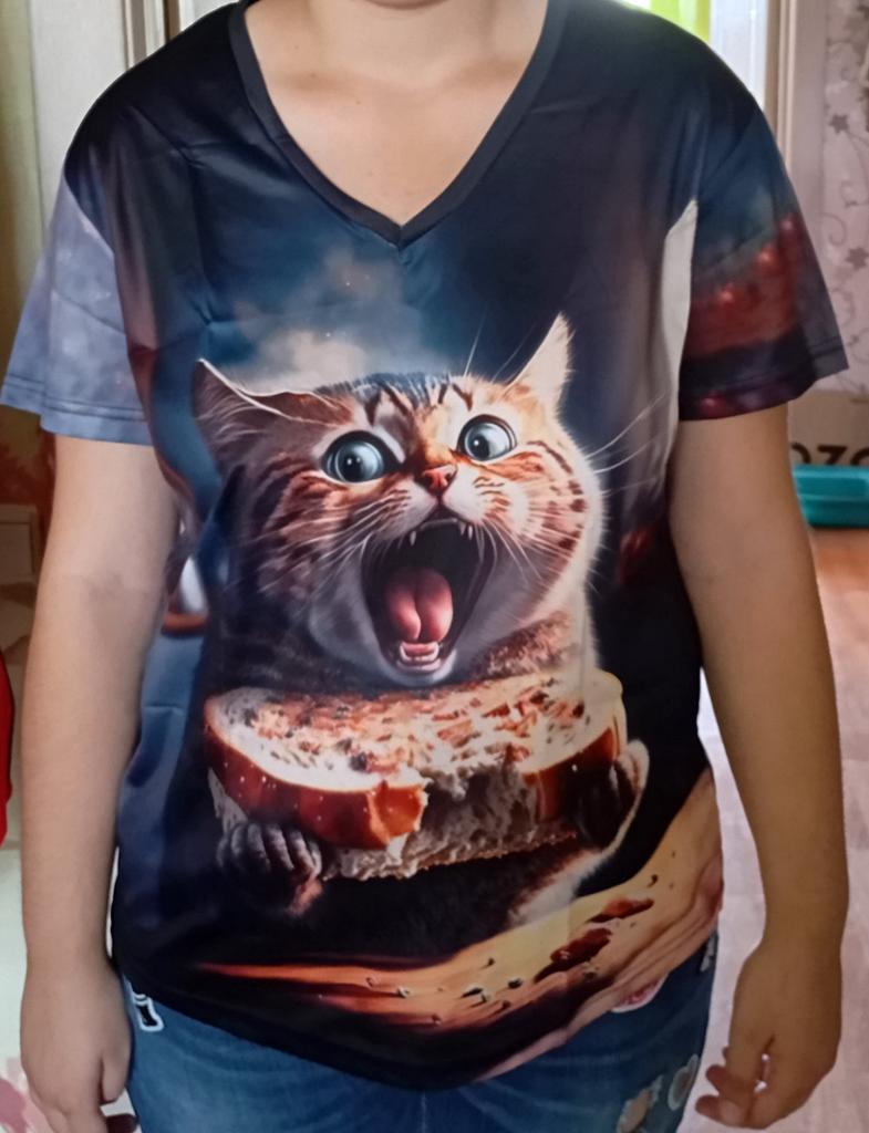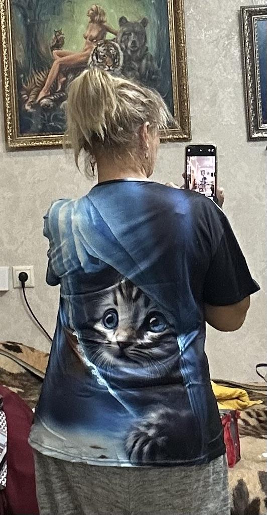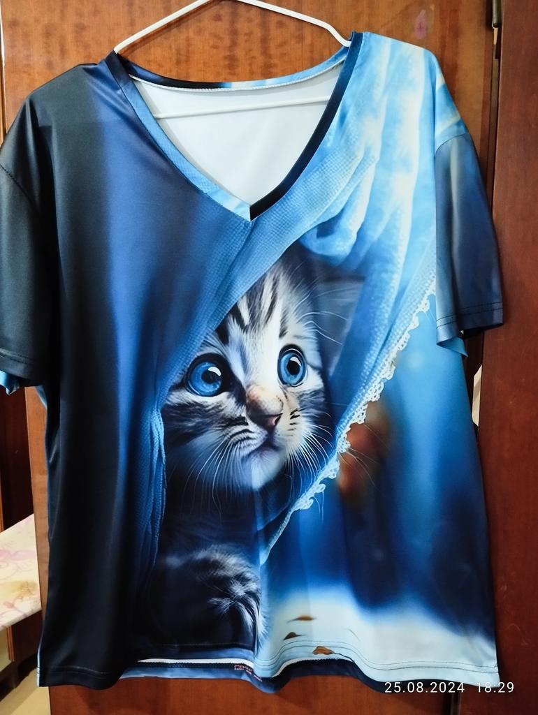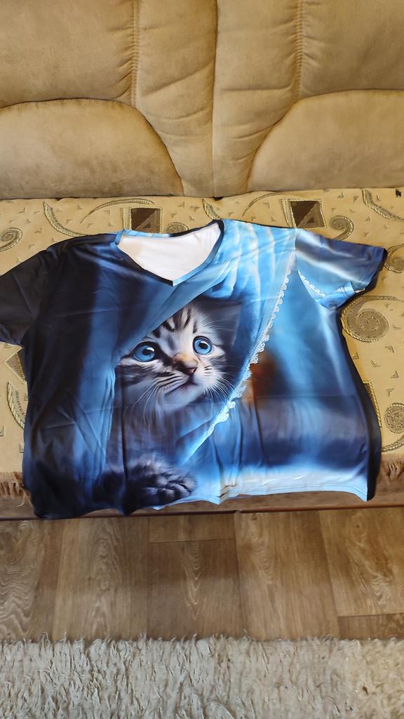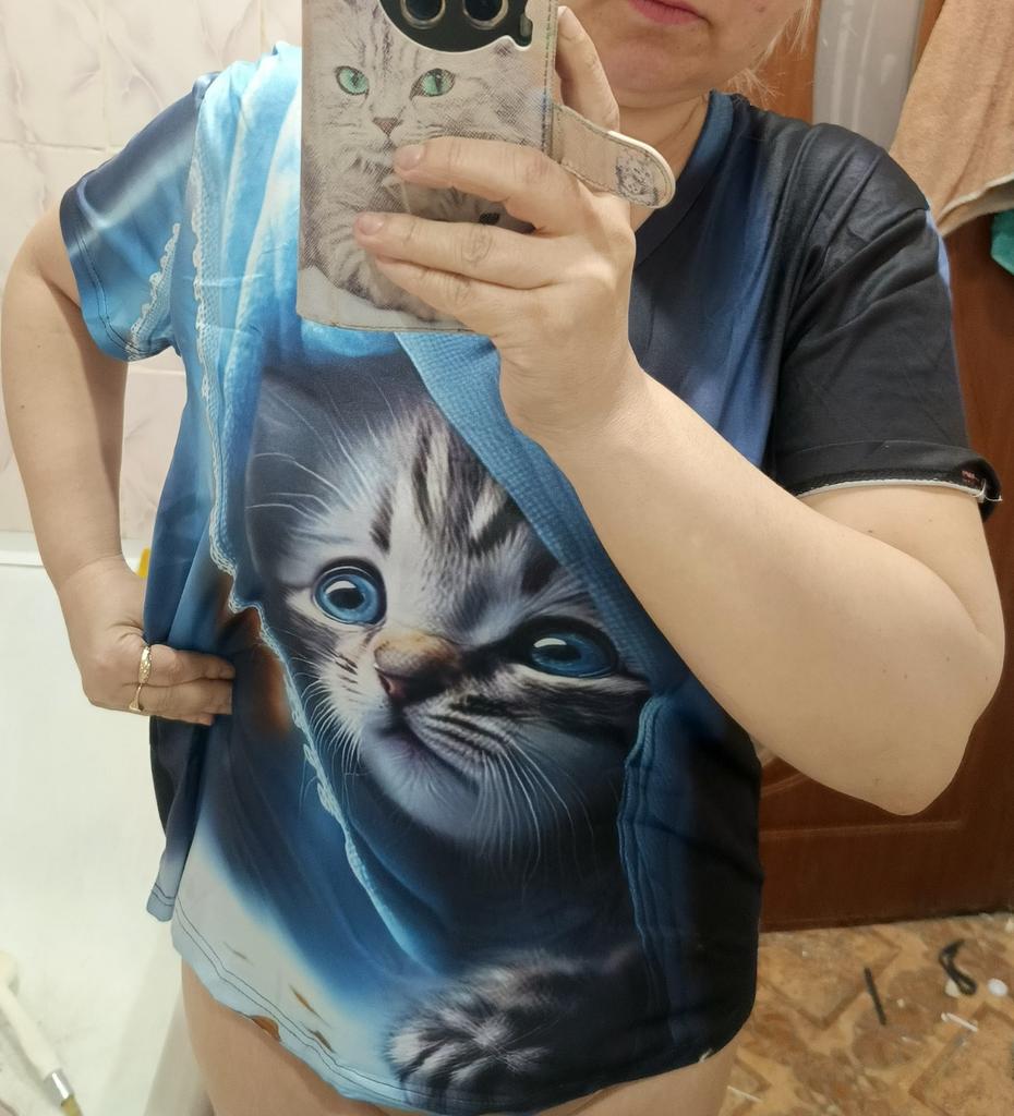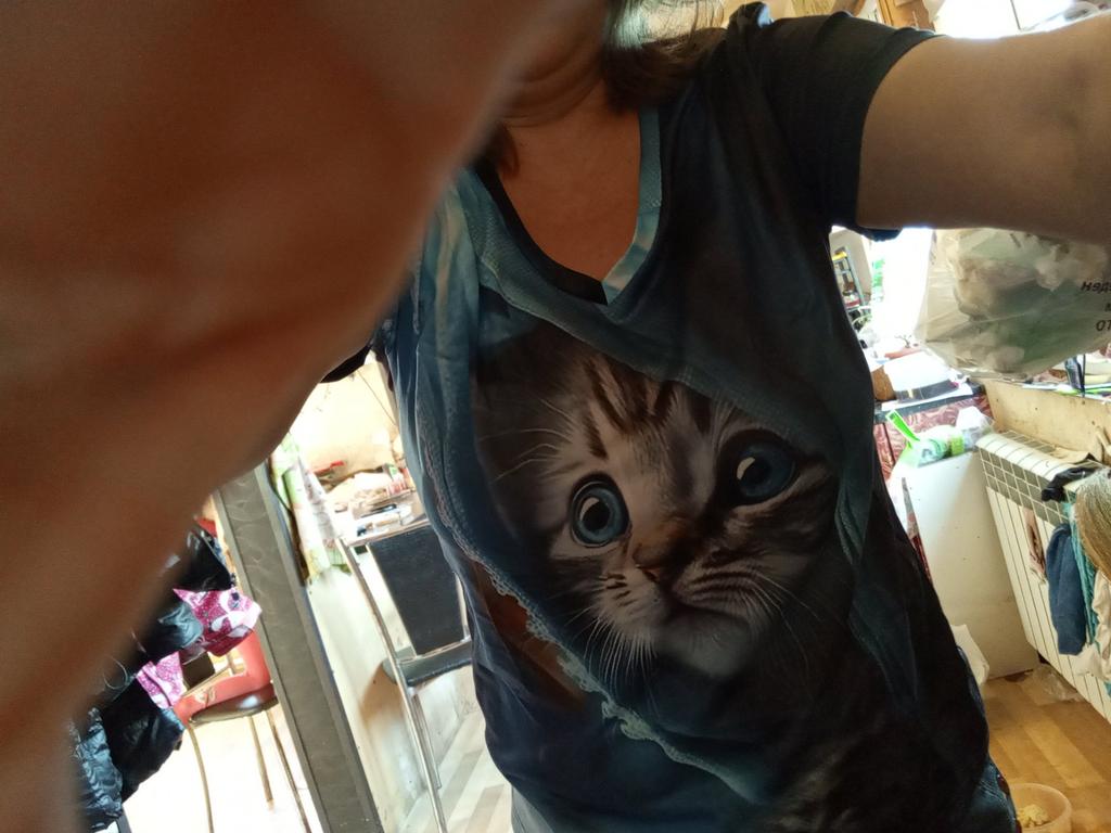 Excellent T-shirt, size L fits perfectly for 46-48, the material is high-quality, pleasant, this is the second one from the series with cats. Thank you.
