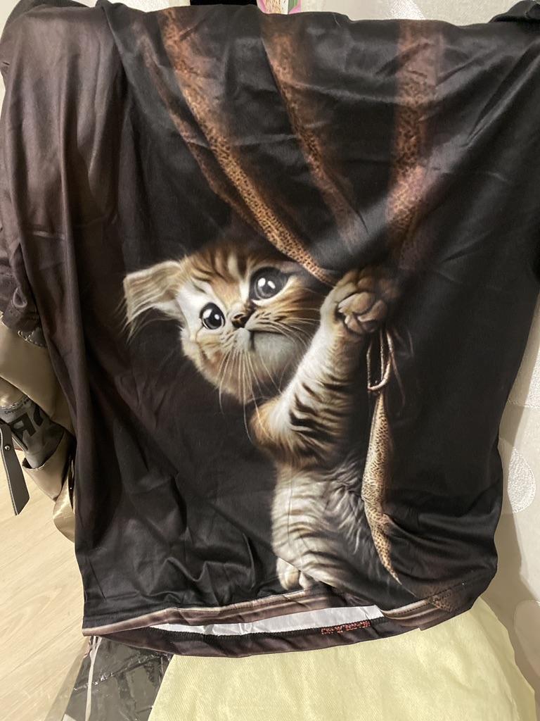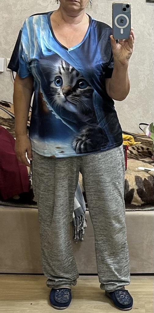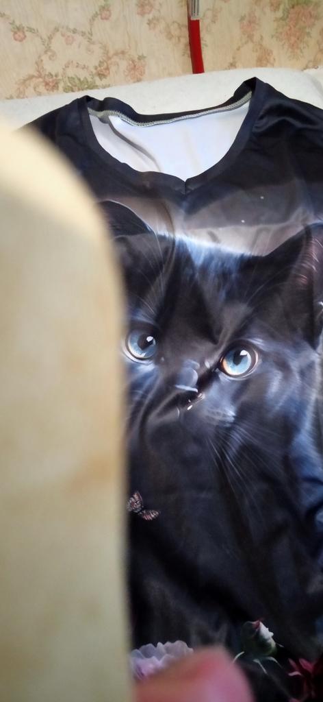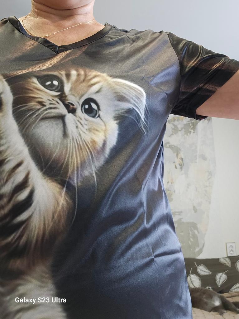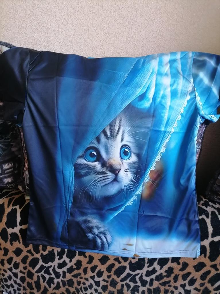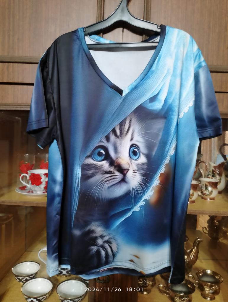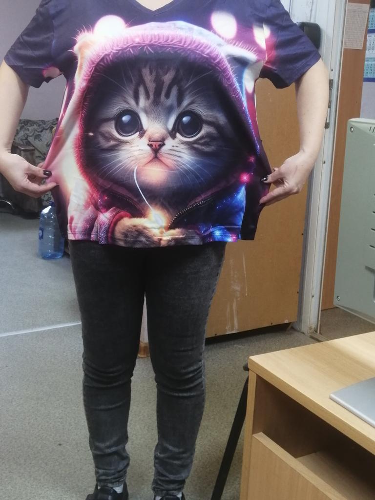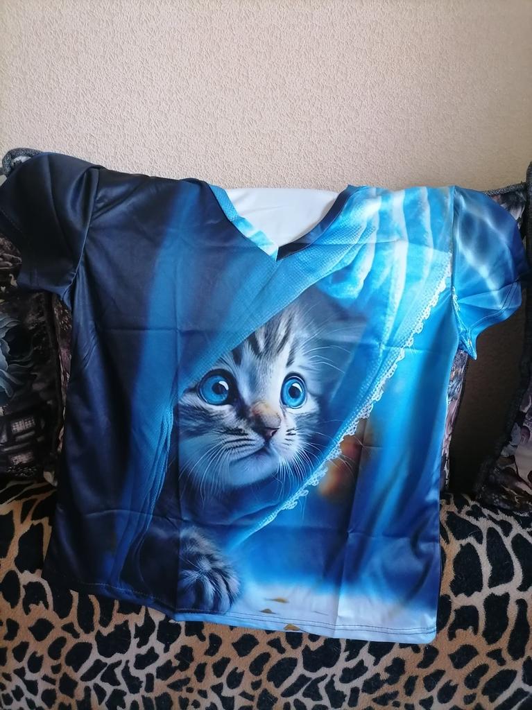 Excellent T-shirt, size L fits perfectly for 46-48, the material is high-quality, pleasant, this is the second one from the series with cats. Thank you.