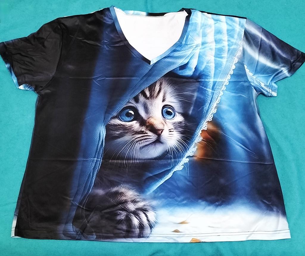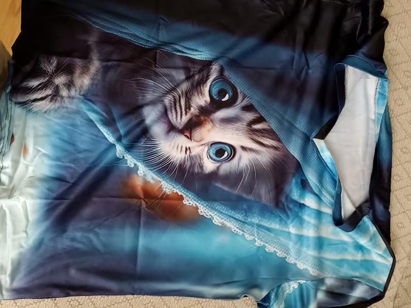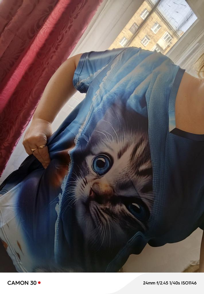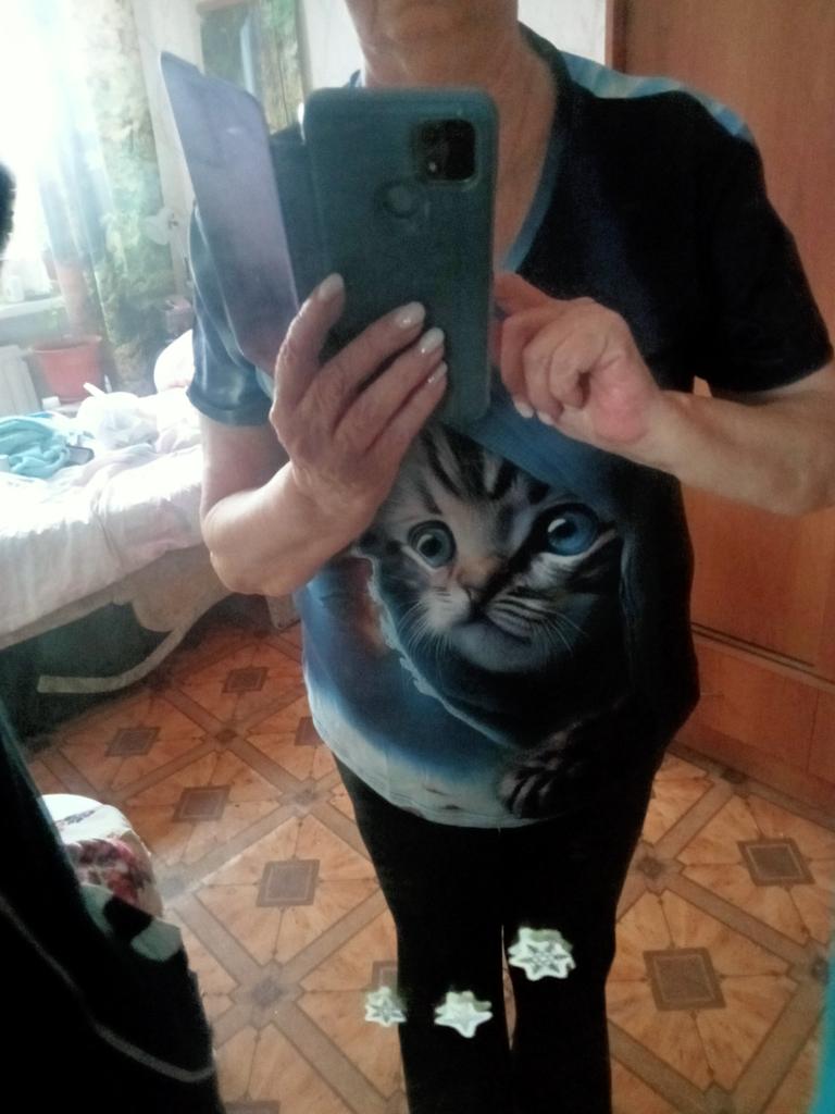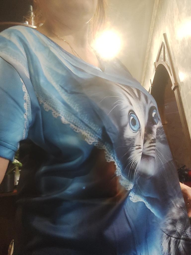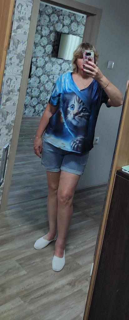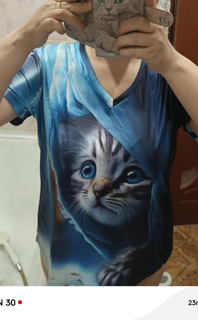 Excellent T-shirt, size L fits perfectly for 46-48, the material is high-quality, pleasant, this is the second one from the series with cats. Thank you.