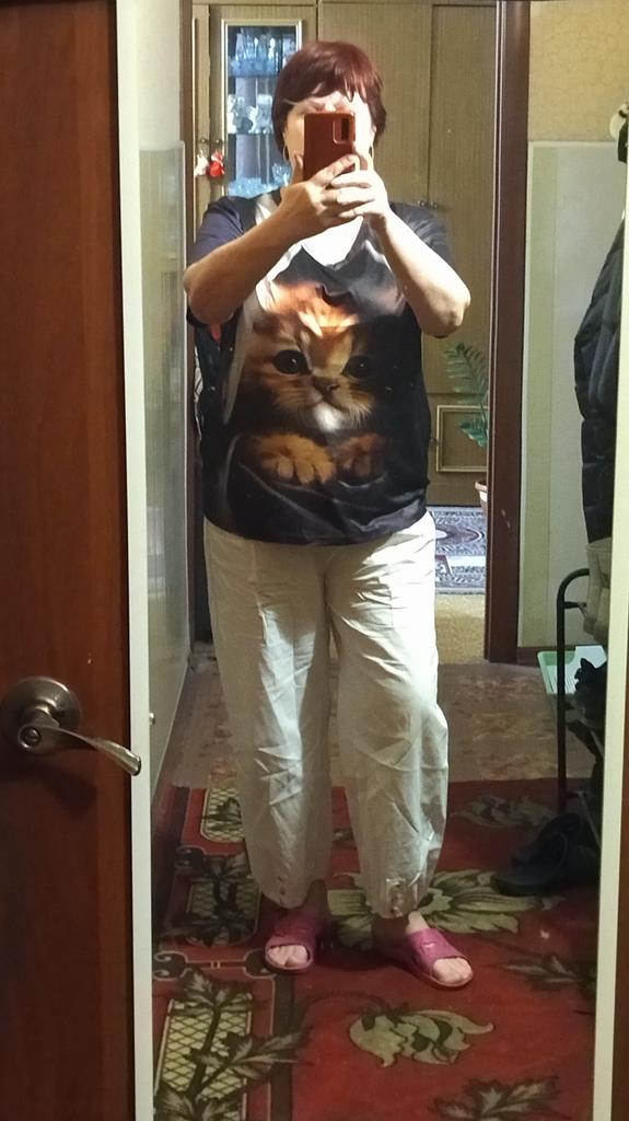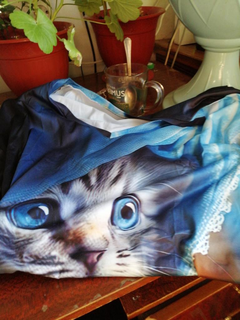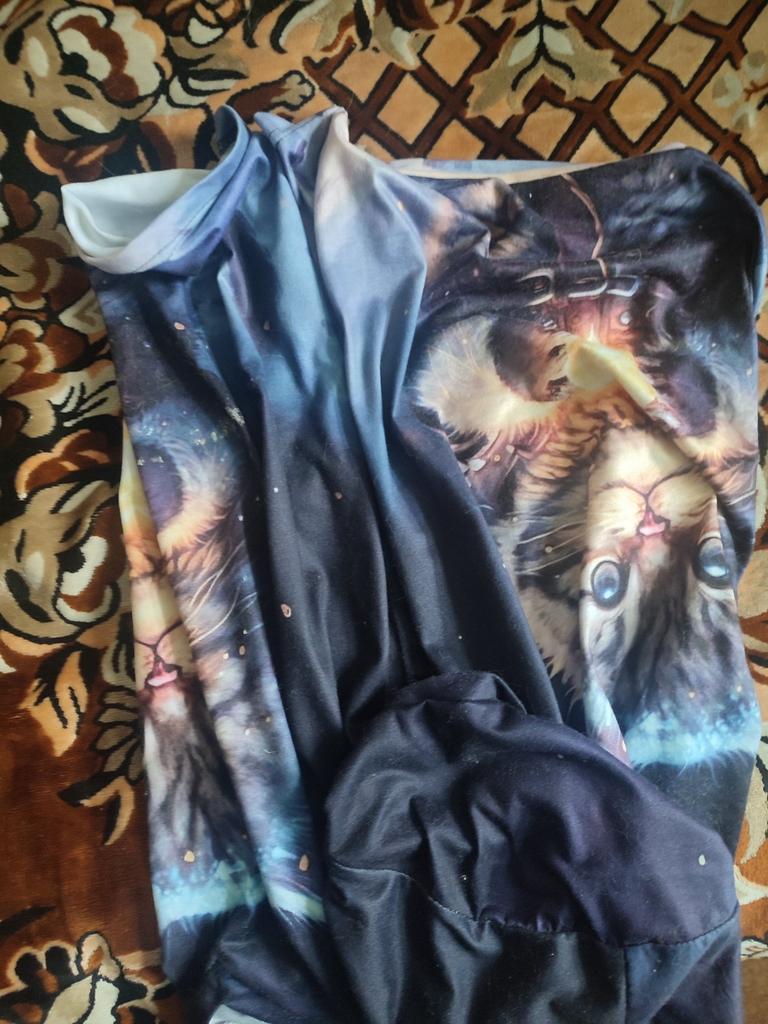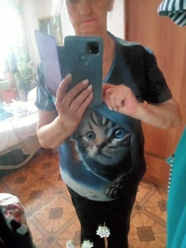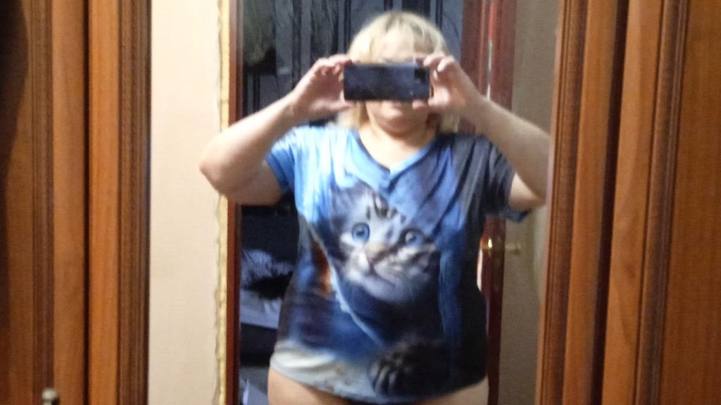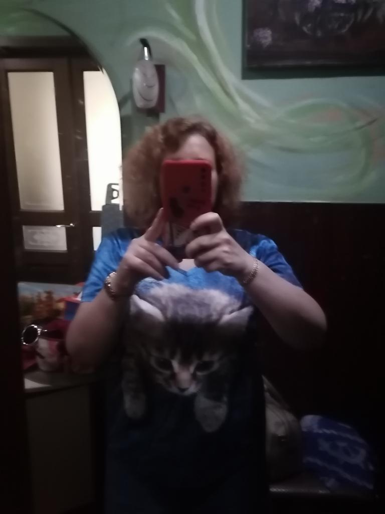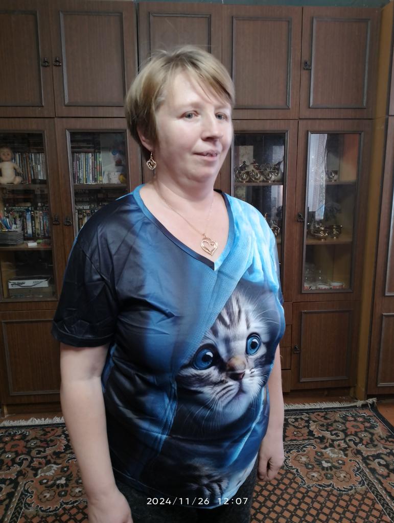 Excellent T-shirt, size L fits perfectly for 46-48, the material is high-quality, pleasant, this is the second one from the series with cats. Thank you.