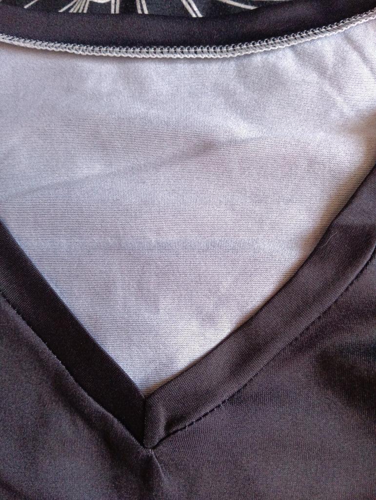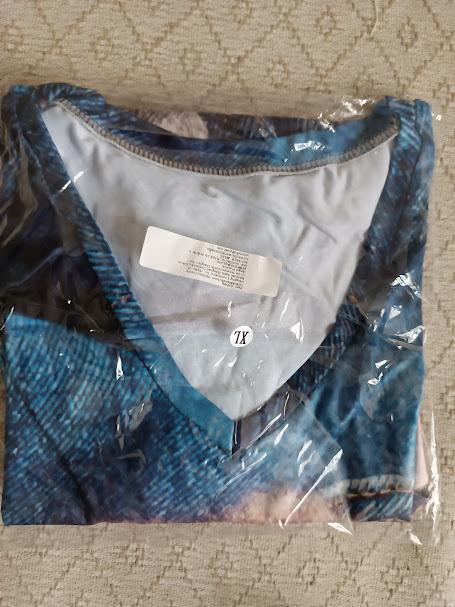 The T-shirt is beautiful - the pattern is like in the photo, synthetic jersey, too big - for my size 52-54 I should have taken 3XL.