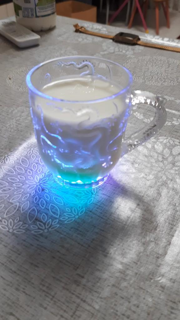 Everything matches the description. Plastic cup. Glows when pouring water. Very beautiful. Thank you!