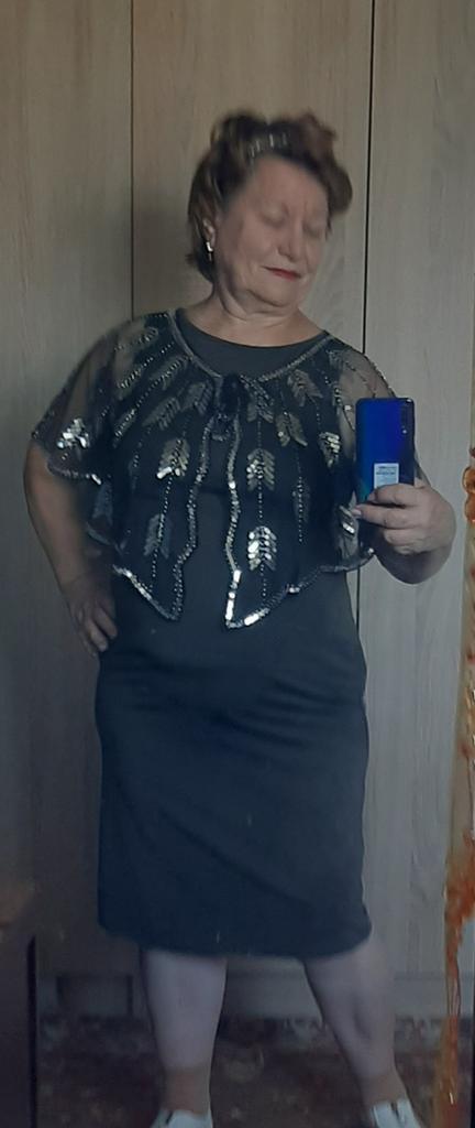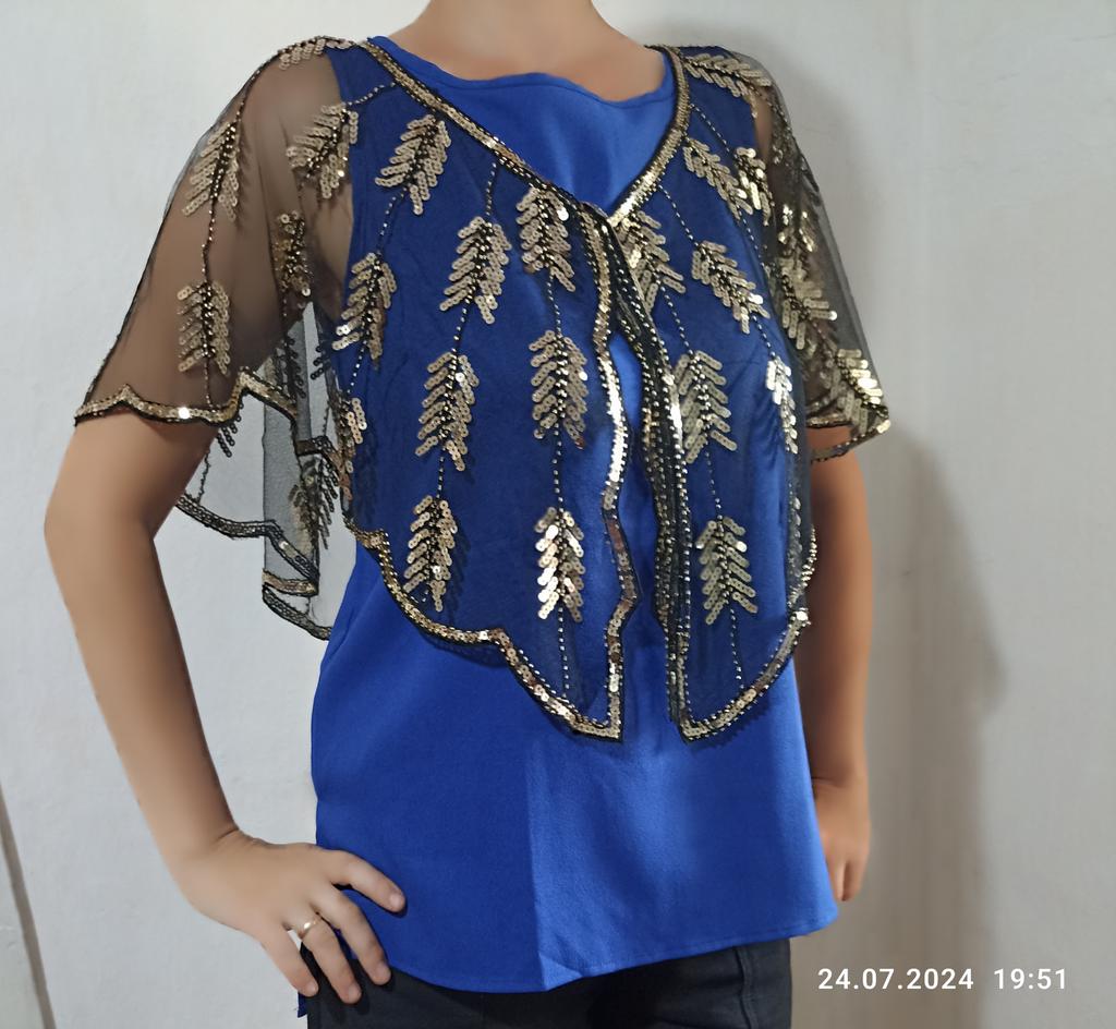 A beautiful cape fits size 46, fits well on the shoulders, looks rich, it will also fit larger sizes.