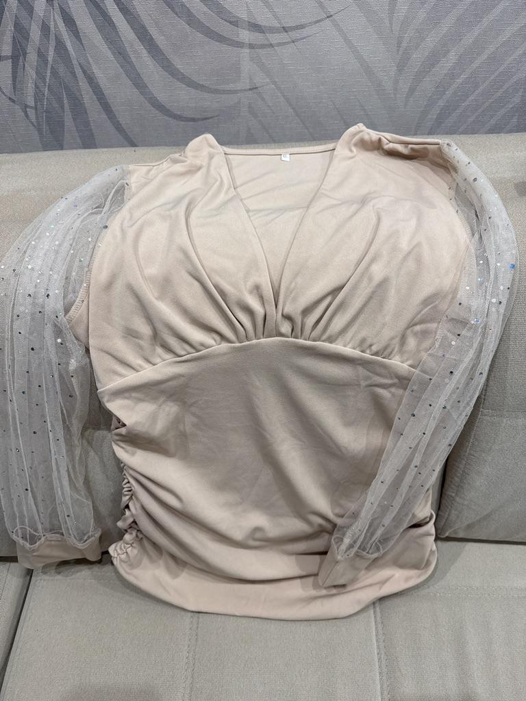The blouse can even be worn as a tunic. Everything is true to size. The chest is moderately exposed. Everything is aesthetic. Thank you.