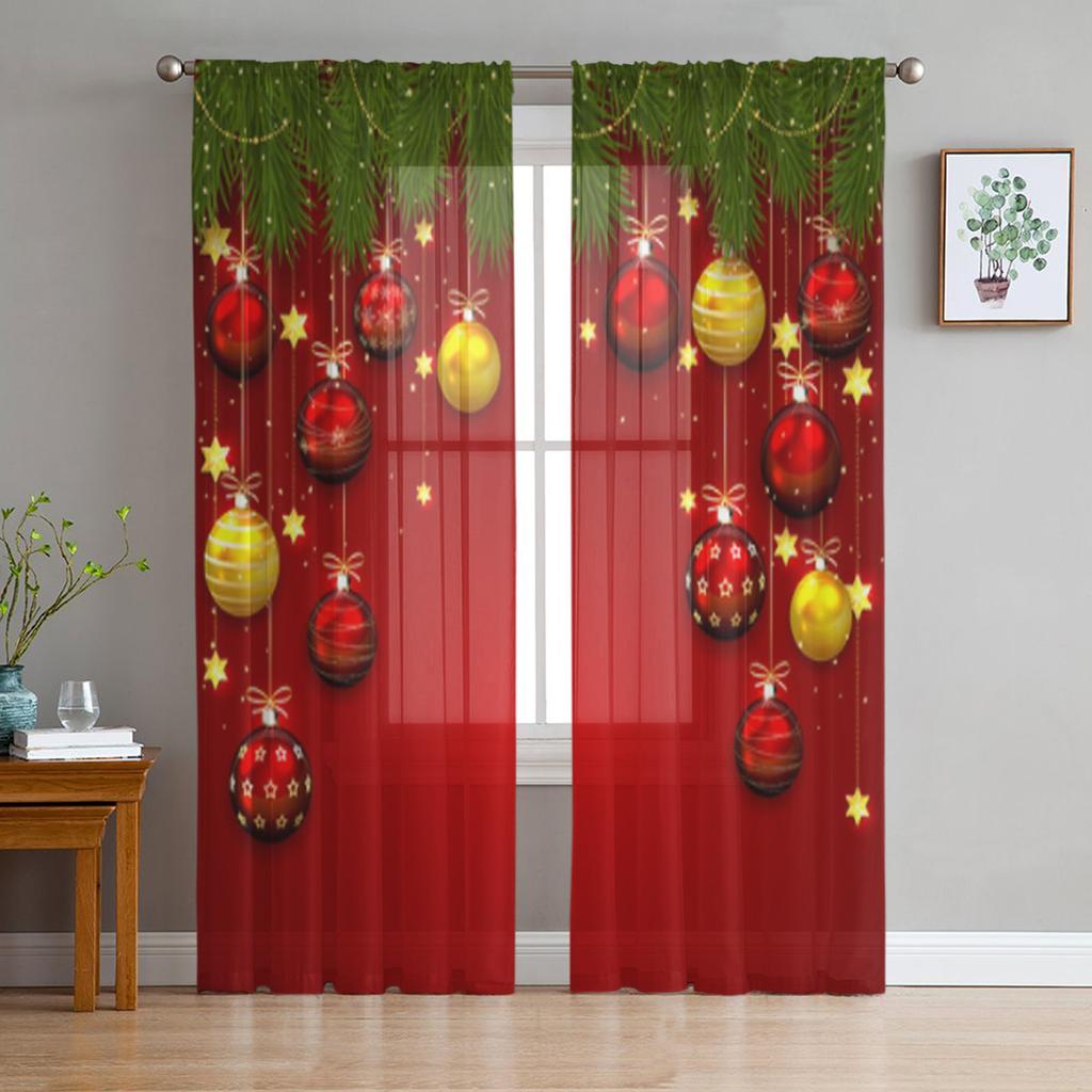 Christmas Balls And Fir Tree Branches Tulle Curtains For Living Room Bedroom Chiffon Sheer Voile Kitchen Curtain