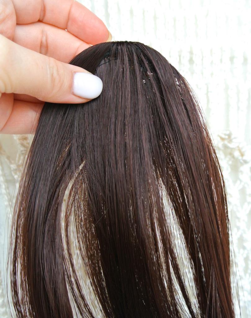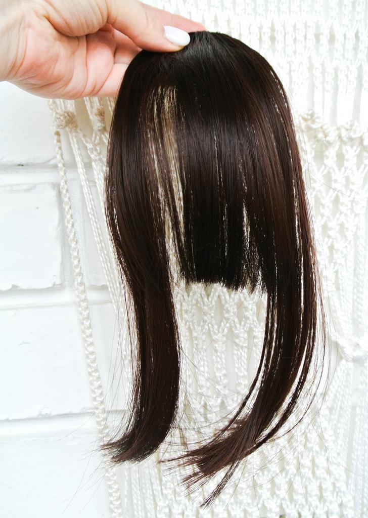 Overhead straight bangs with extended strands Total length about 28 cm. Not fluffy, looks natural. No synthetic shine. Hair is soft and pleasant to the touch. Attached to tress.