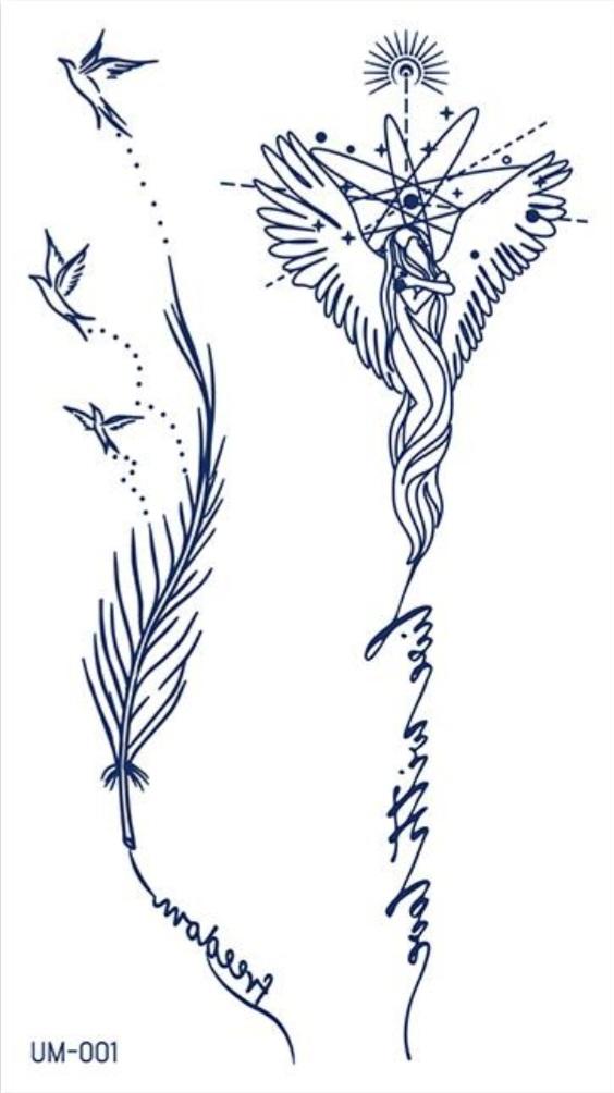 Feather: ①waterproof; ②sweatproof; ③non-toxic; ④durable and long lasting (7-15days). Depending on shower times and being scrubbed with soap and water times; ⑤looks like a real tattoo; ⑥quick and easy to apply;