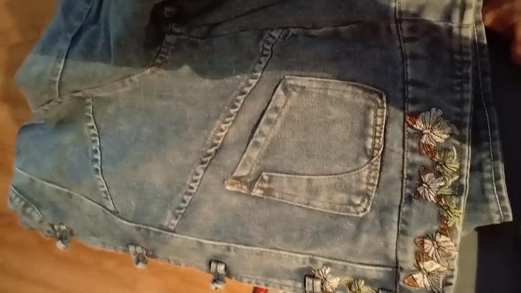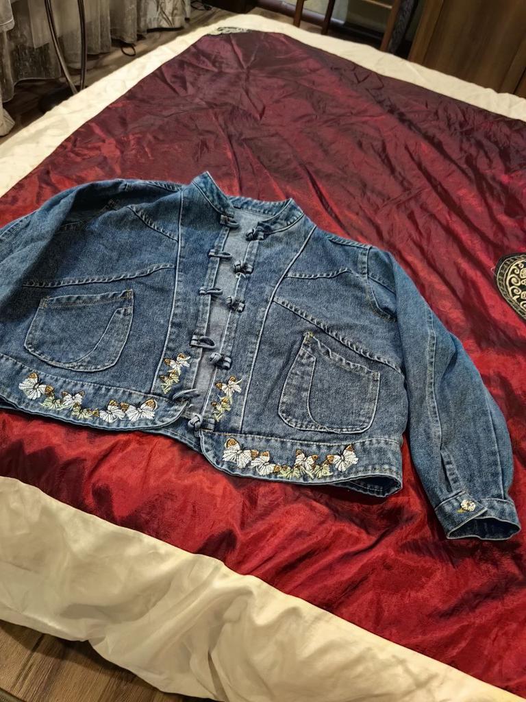 A very unusual short denim jacket with butterfly embroidery, odorless, butt-butt with decorative buttons. Thank you!