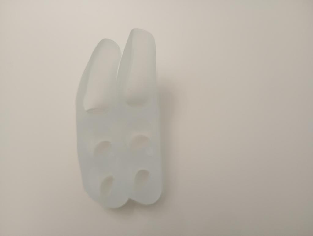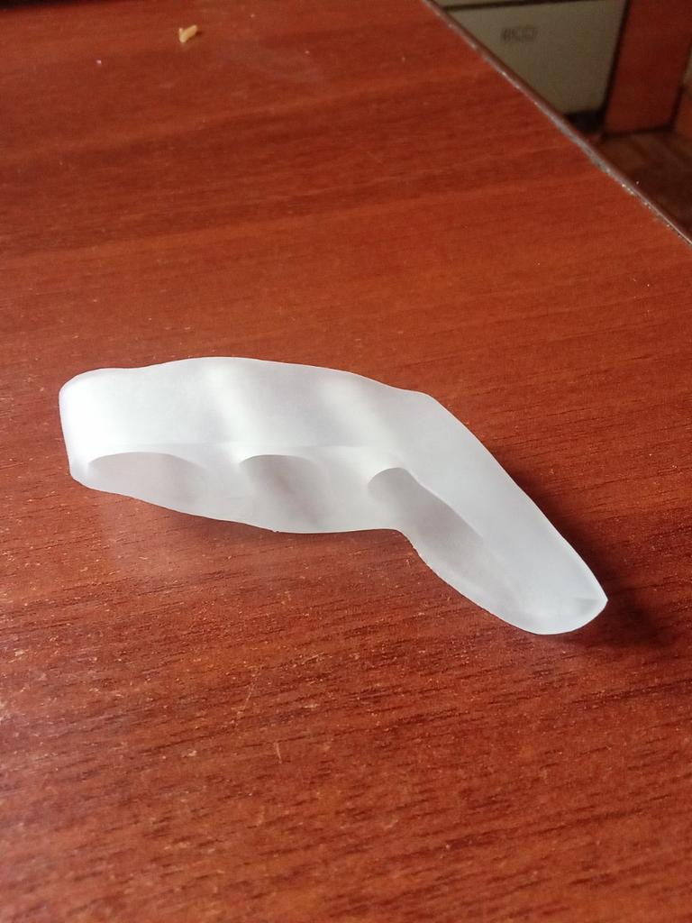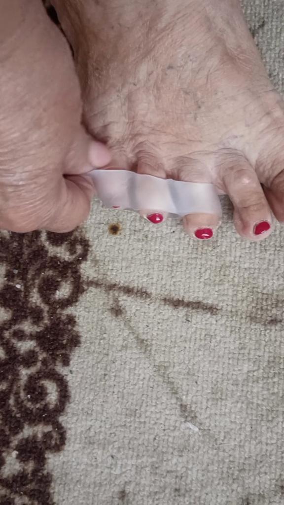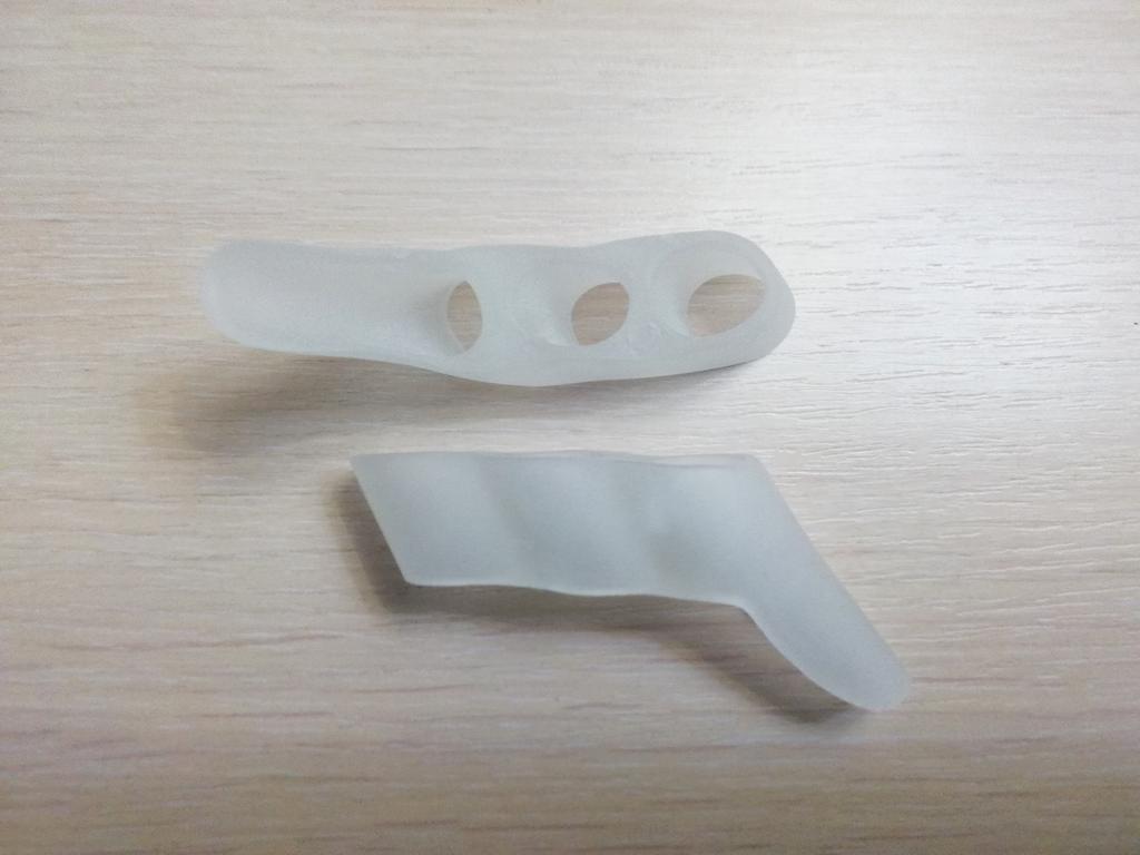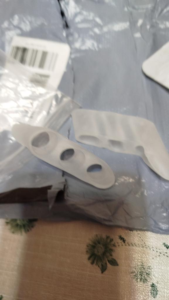 Silicone splay. Soft. Bought by me for a crooked little finger. Straightens the fingers and prevents them from rubbing against each other. Protects the little finger from friction against shoes. The second photo is for illustration "before".