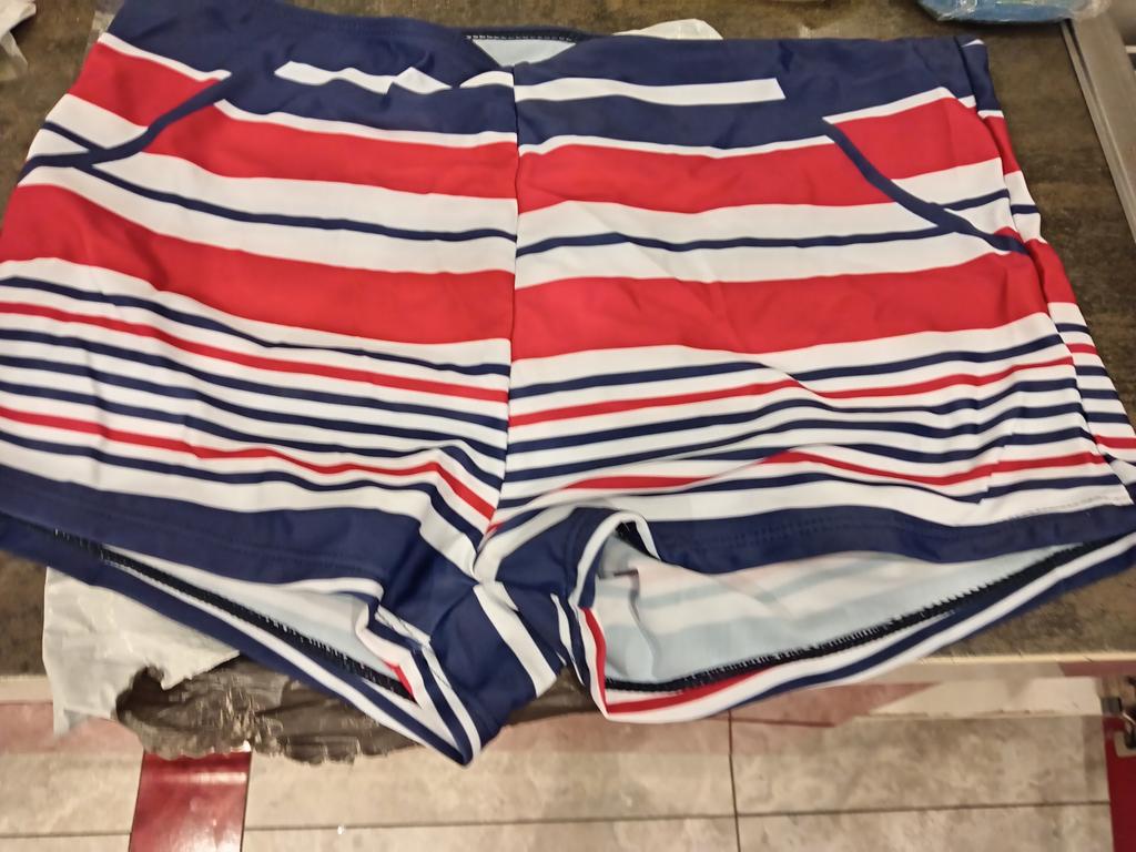 It's sewn very strangely, the stripes in the front don't match. That makes the swimming trunks look bad. The top is normal.