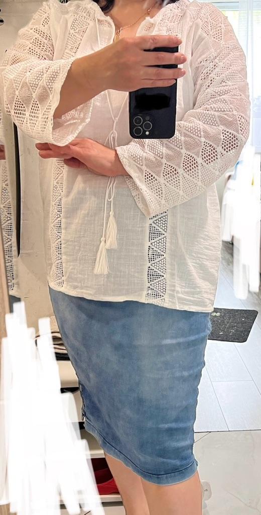 2024 Fashion Lace Blouse Women Tops Summer White Clothes Casual Loose Stitching Hollow V-neck Three Quarter Sleeve Cotton Shirt 242941