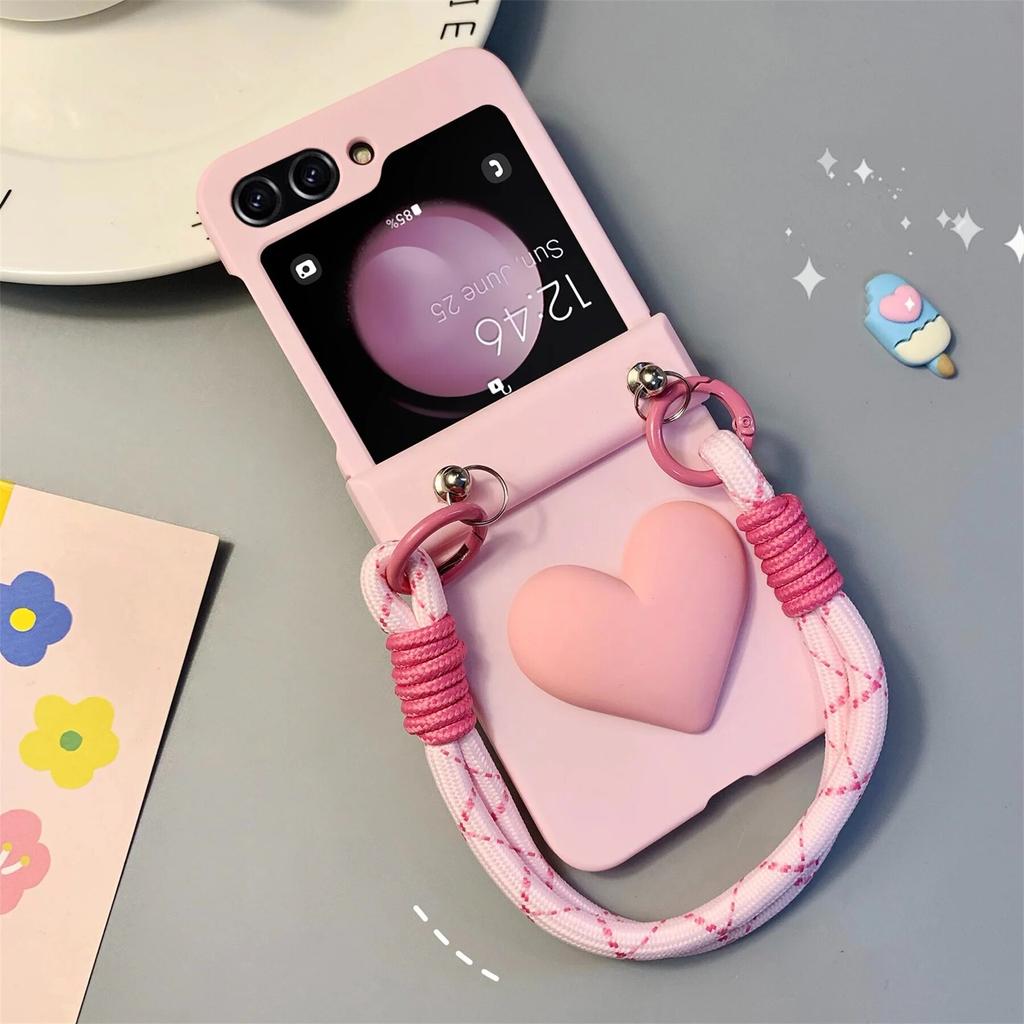Fashion Simple Pink Love Portable Rope Chain Case for Samsung Galaxy Z Flip 5 Flip3 ZFlip4 Wrist Strap Shockproof Back Cover