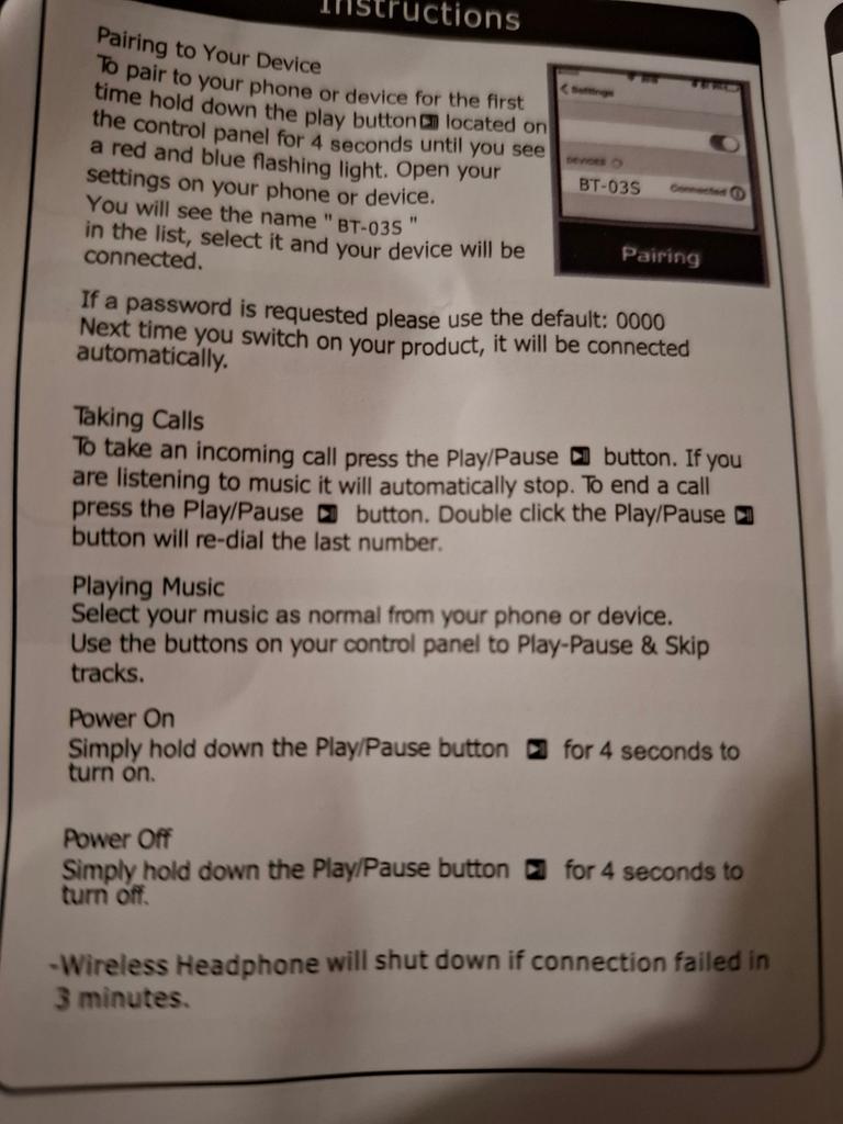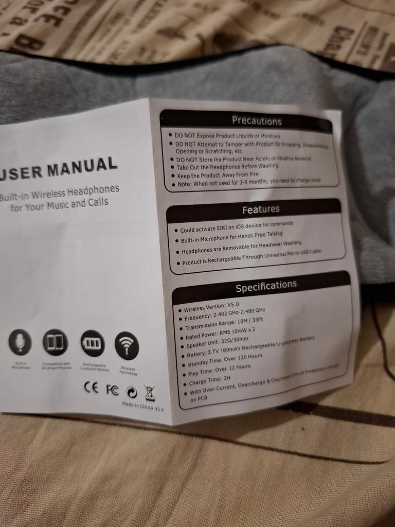 There were no instructions in the package and the speakers are too small in size, they don't fit into the ears (for a small head), but they work and the sound quality leaves much to be desired, although the material from which they are sewn is pleasantly soft