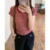 American Retro Striped Contrast Color Right Shoulder T-Shirt Women's Short Sleeve Spring and Summer Design Slim U Neck Short Flying Sleeves Short Top