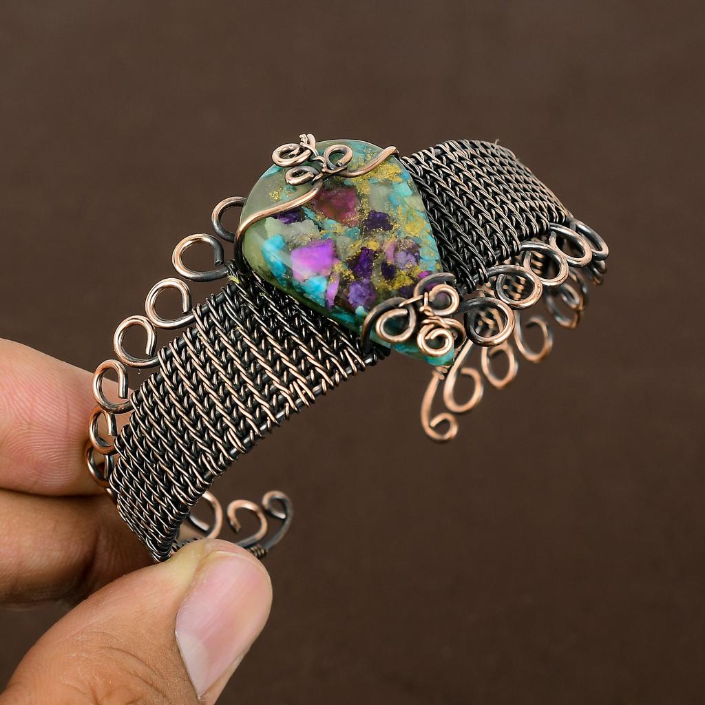 Natural Spiny Oyster Gemstone Handmade Copper Wire Wrap Bangle Adjustable A7b24