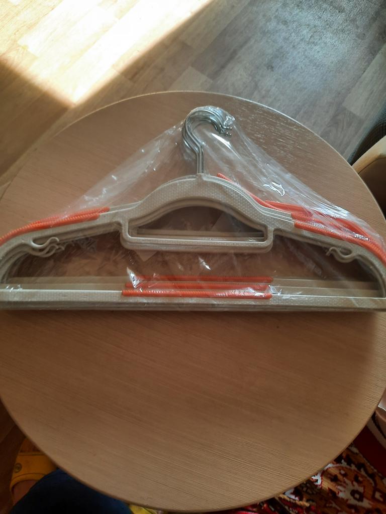 Ten plastic hangers. Thin, slightly "walking", have an anti-slip coating. Not for heavy things.