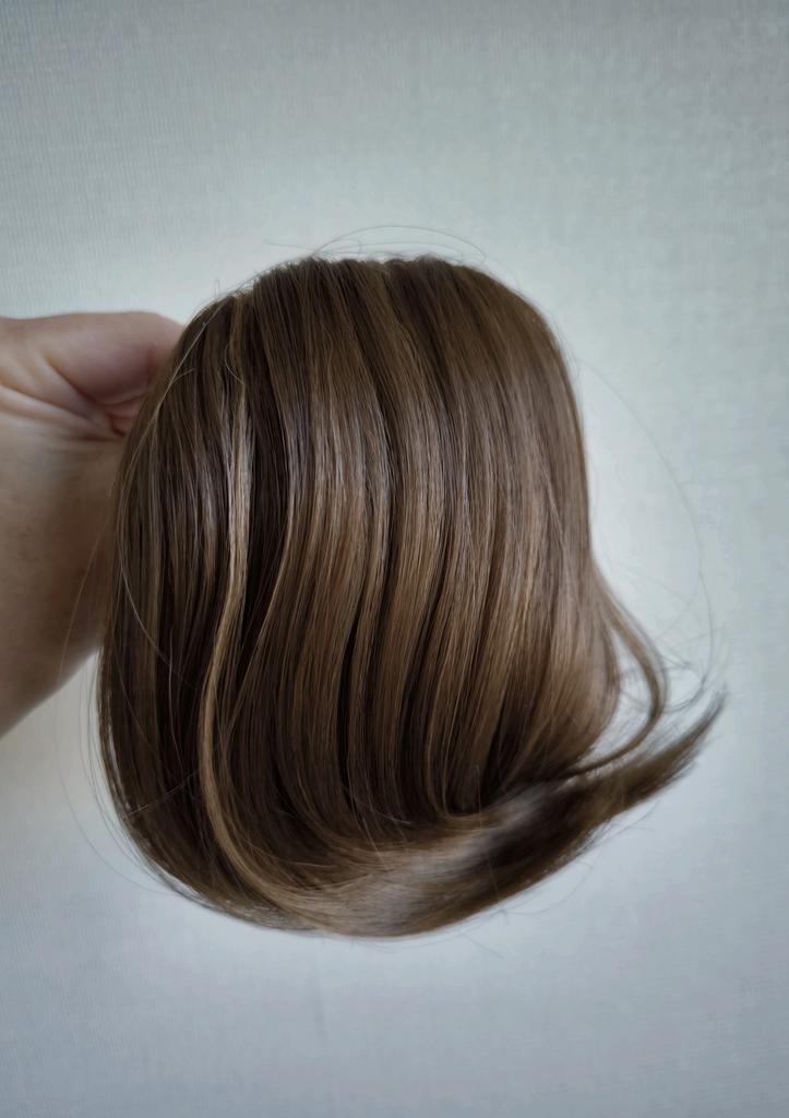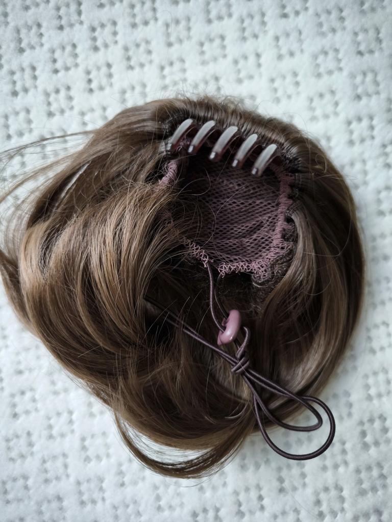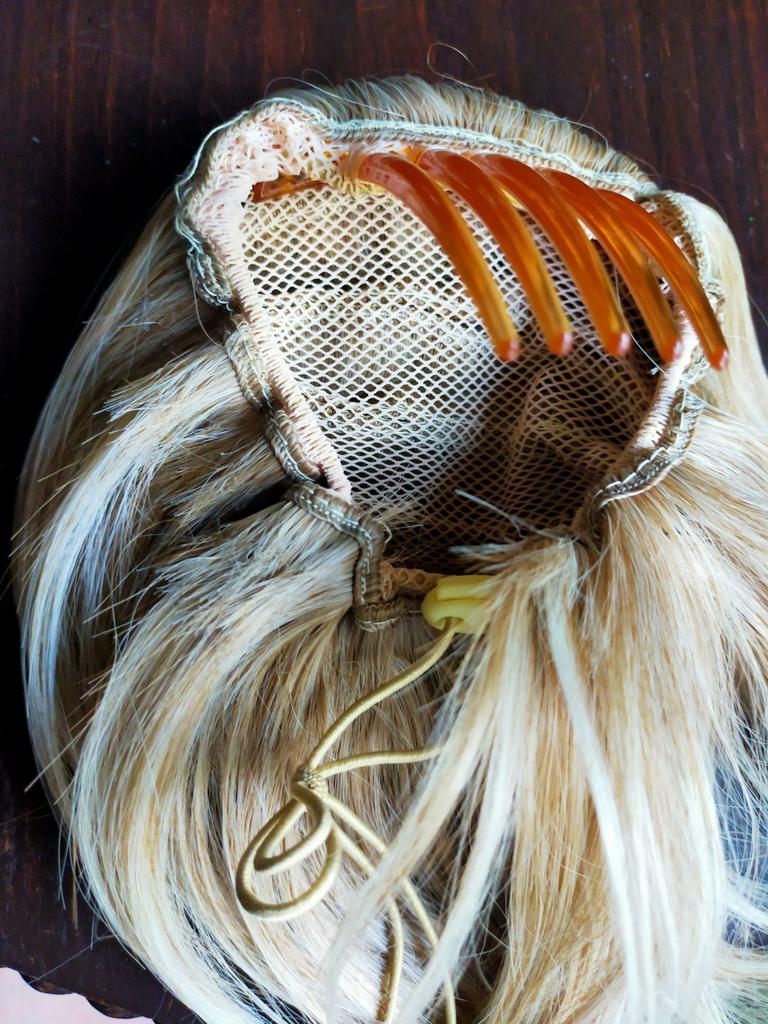 Tail on a plastic comb It really does look a bit like a bun.. The hair curls downwards. Looks cute and very natural. Fixed with a comb and a special bag quickly and securely. The elastic cord needs to be shortened a little, it is too long. holding on tight. Good quality hair. Without doll shine. Length 17 cm. If you straighten the curl, the ponytail will be longer. I can recommend it 🤗