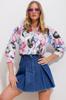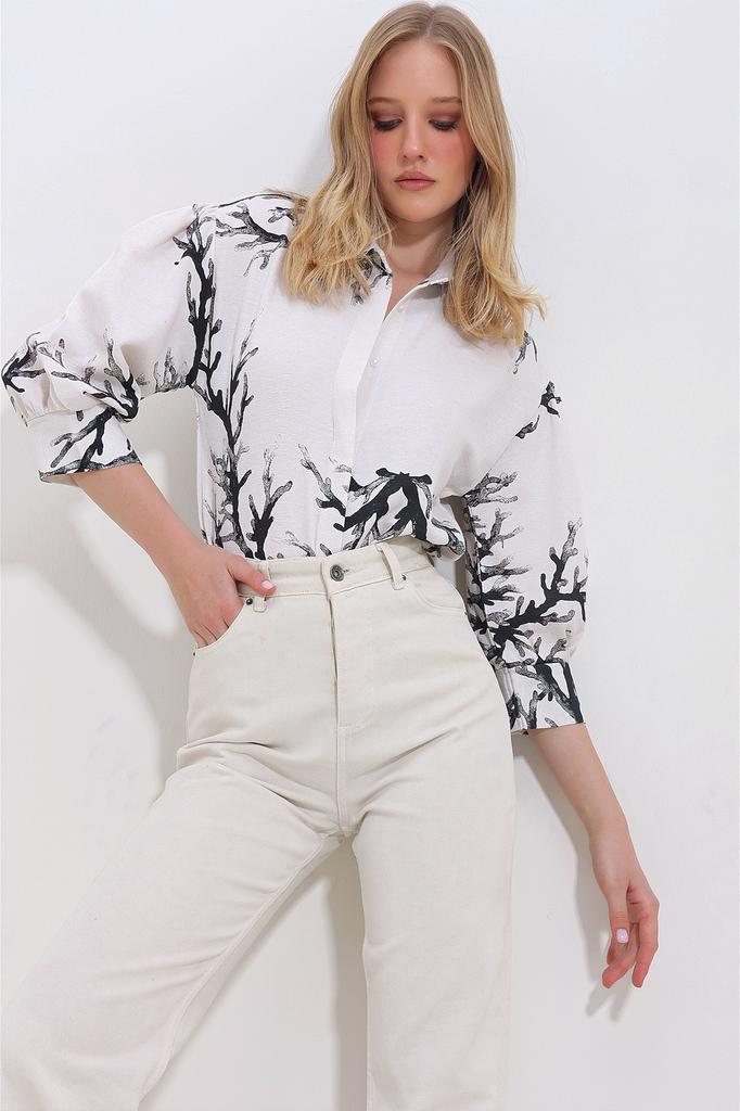 For Women Who Want to Achieve Trendy Elegance in the Office, Alaçatı Style Branch Patterned Balloon Sleeve Hidden Placket Linen Shirt with Relax Fit Pattern, Designed with Balloon Sleeve Detail, with Cotton Linen Fabric, Which You Can Easily Combine with Any Style of Jean Trousers, Woven Trousers, Tights, Shorts and Skirts, is Here!! !.-.