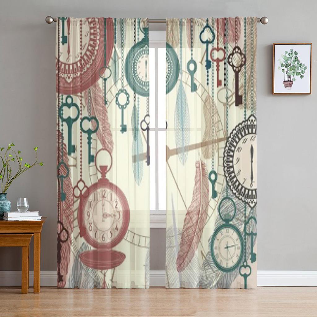 Vintage Pocket Watches Feathers Sheer Curtains for Living Room Transparent Tulle Window Curtain Bedroom Kitchen Veil Drapes