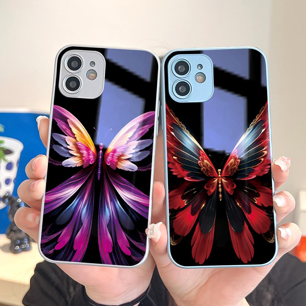 Colored Butterfly Phone Case Metallic Lacquer Tempered Glass Shockproof Cover for Huawei Honor iPhone OPPO Realme OnePlus Xiaomi Redmi Samsung Vivo