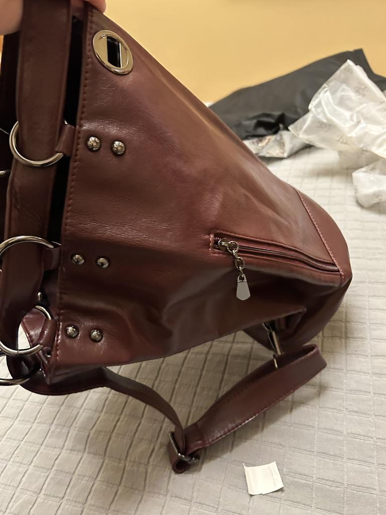 Smells a little bit of chemicals, but it will air out very quickly. I already had such a bag in black, I wore it for five years, and then I gave it to my sister:) , I think she will wear it for a long time too. The bag is gorgeous, I recommend it.