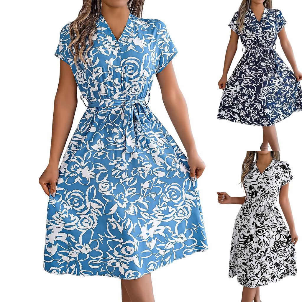 Spring And Summer Casual V-neck Button-down Short-sleeved Flower Swing Dress Cross-border Women's Clothing