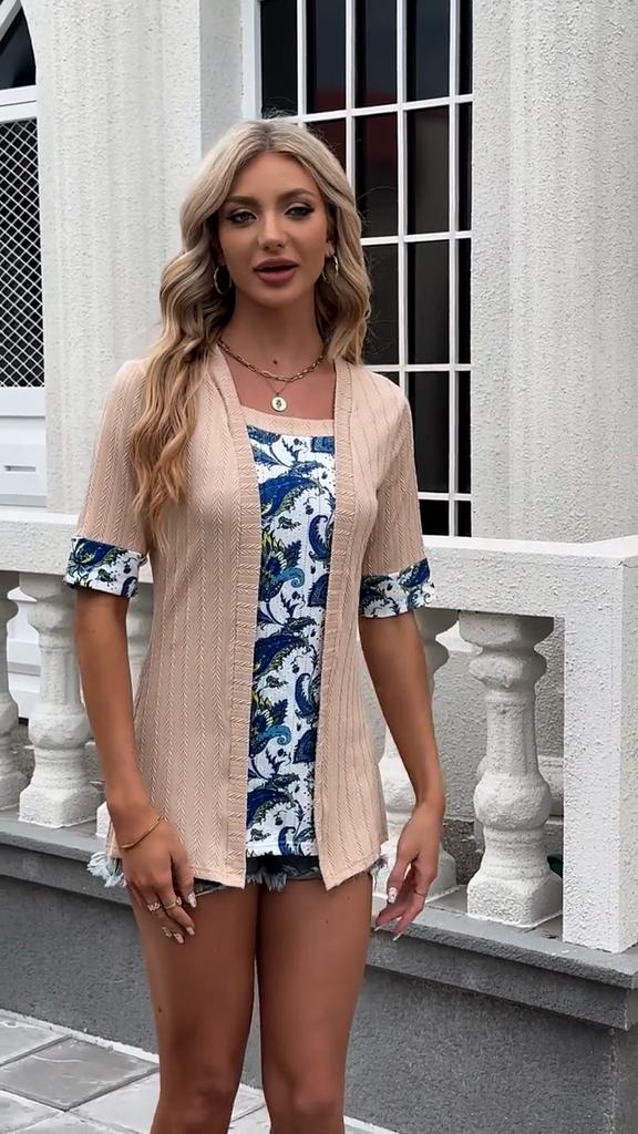 Summer Women's Printed Fake Two Piece Square Neck Mid Sleeve Top T-Shirt