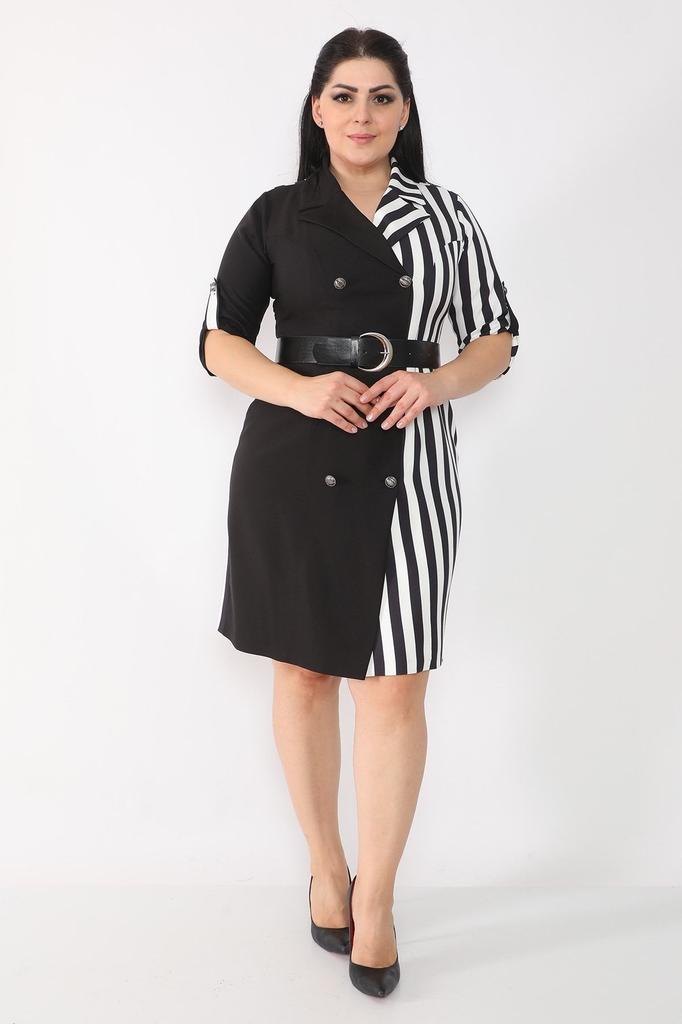 Women's Black Double Breasted Collar Stripe Patterned Fake Button Dress