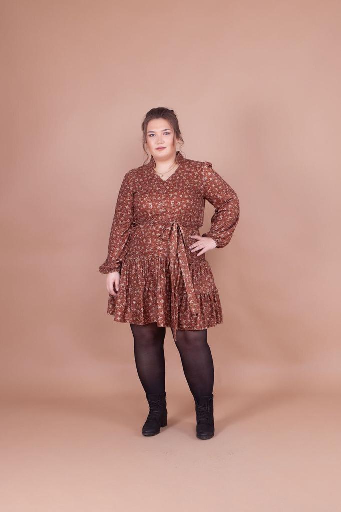 Women's Big Size Dress Plus Size Tan Velvet Floral Patterned Collar Detail Dress
