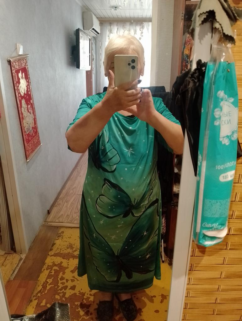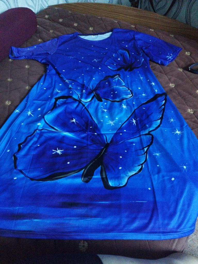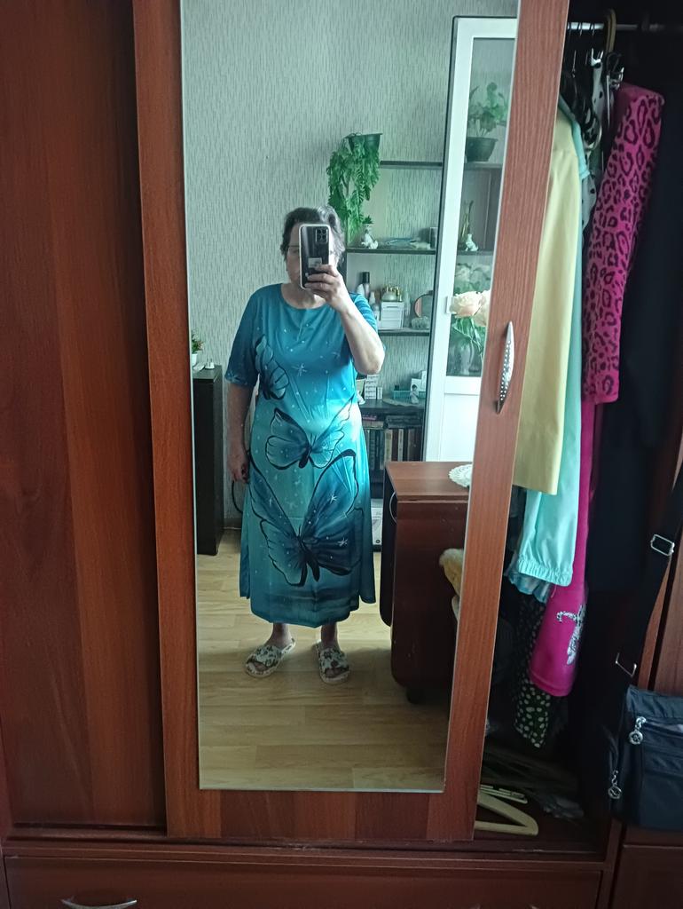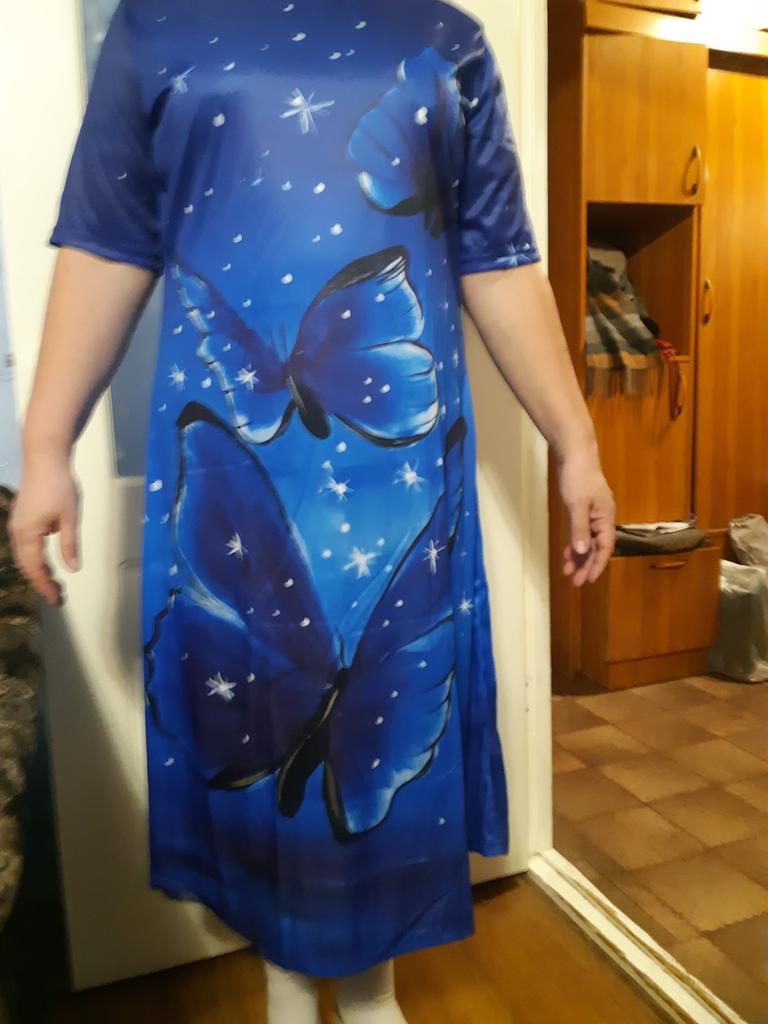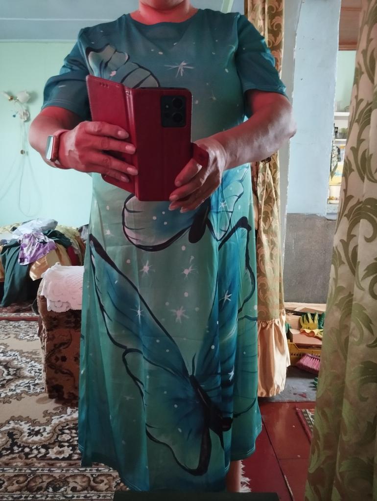It's good that it runs large, shoulders like a grenadier!!! In general: completely ripped it apart, made darts where they were needed, cut off all the excess and the dress became a dress)). In short, girls, without alteration it's a sack with sleeves. When ordering, I was more guided by the print.