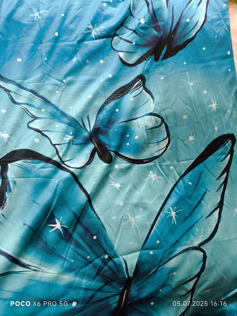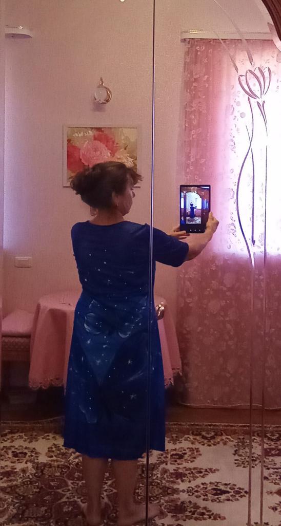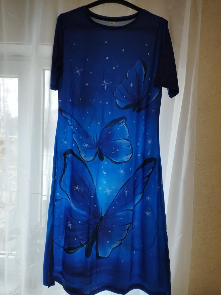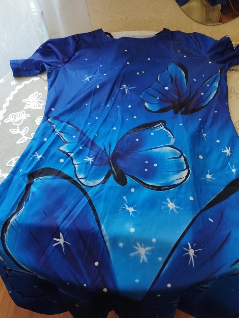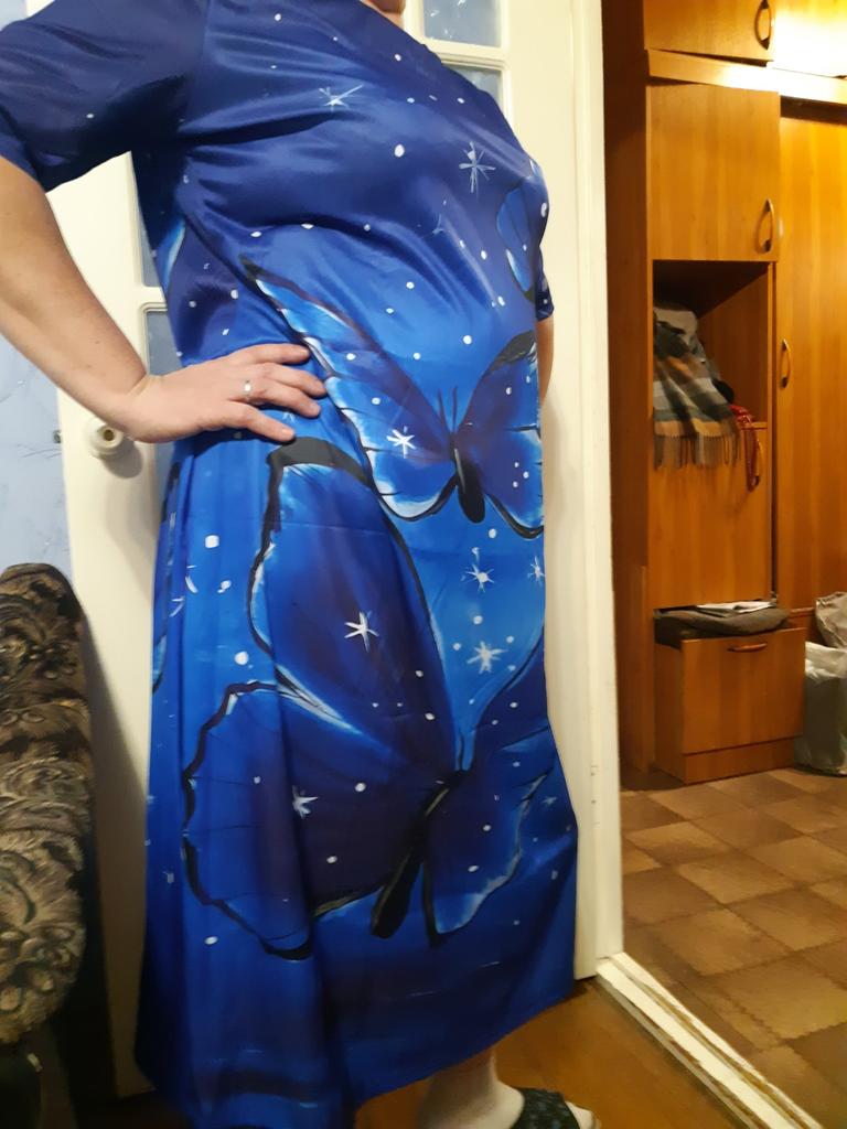 It's good that it runs large, shoulders like a grenadier!!! In general: completely ripped it apart, made darts where they were needed, cut off all the excess and the dress became a dress)). In short, girls, without alteration it's a sack with sleeves. When ordering, I was more guided by the print.
