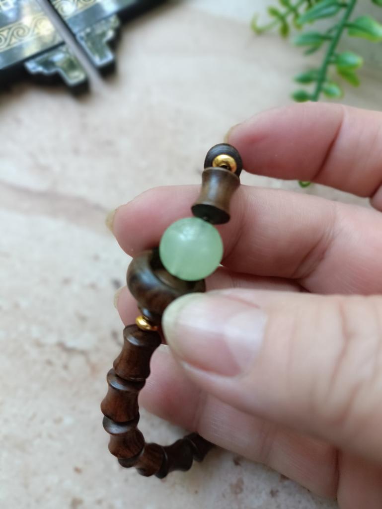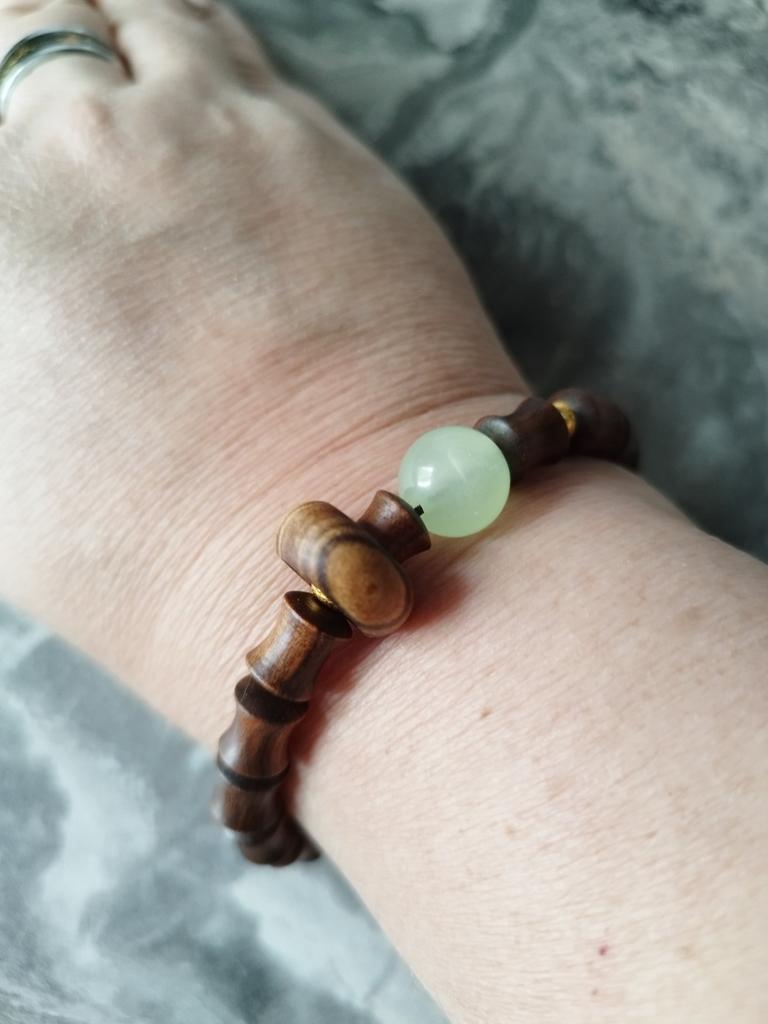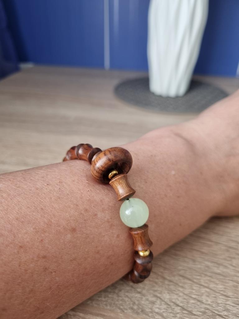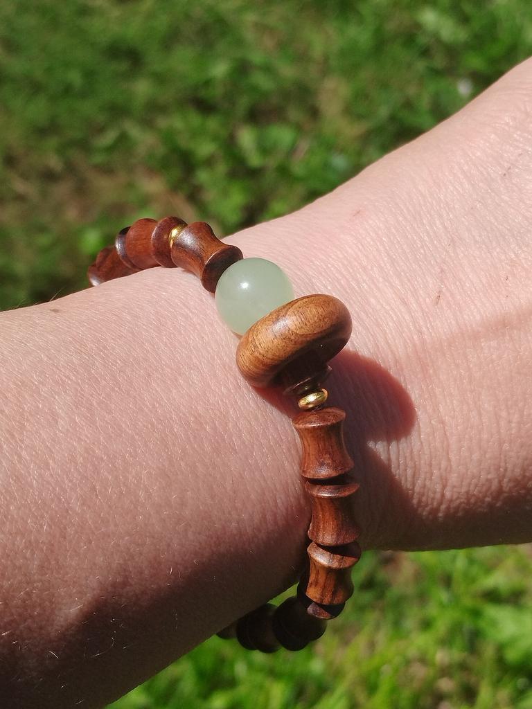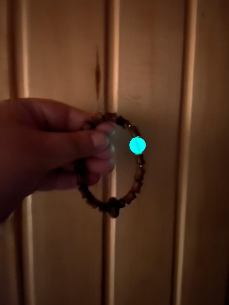 This beautiful sandalwood bracelet has completely captured my attention. This bracelet is not only aesthetically pleasing with its elegant design, but it also has a special meaning that makes it unique.. The bracelet is made of sandalwood. Sandalwood is not only attractive, but is also often associated with calm and meditation, making it a great choice for those looking for a spiritual touch in their accessories.. The little green ball that adorns the bracelet is the real star. What makes it even more special is that it lights up in the dark, creating a magical and eye-catching effect. This detail not only adds a fun and distinctive touch, but also symbolizes light in the darkness, reminding us that there is always hope and beauty, even in the most challenging times.. The bracelet is comfortable to wear and its versatile design can be easily combined with different styles and outfits. Without a doubt, this sandalwood bracelet has become one of my favorites, not only for its visual appeal, but also for the symbolism it represents. I recommend it to anyone looking for a special and meaningful piece.