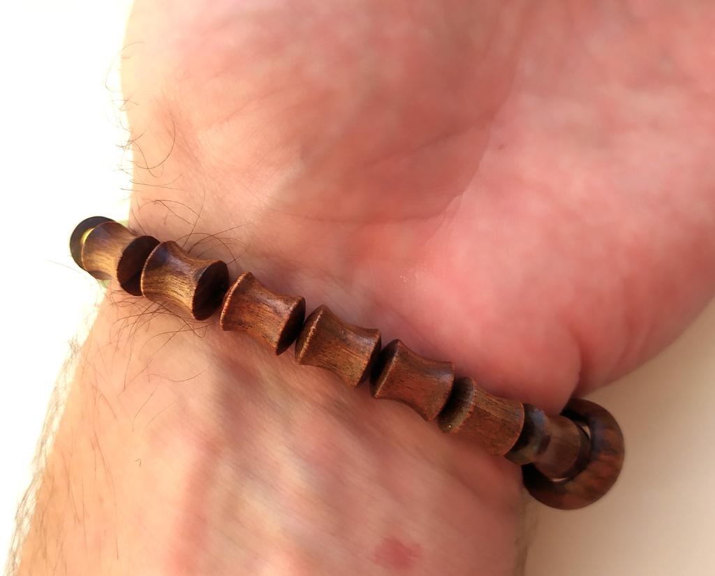 Sandalwood Bracelet. The aroma of sandalwood calms the mind and stimulates clear perception of the world. A brutal and functional bracelet model with an excellent price-quality ratio. An ideal gift for those who practice yoga and meditation. The beads are strung on a reliable elastic band, which will give the bracelet durability, flexibility and beauty. Does not squeeze the skin. The number of brown beads is 17, one white bead in the center and a sliding wooden ring.